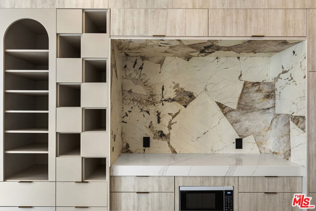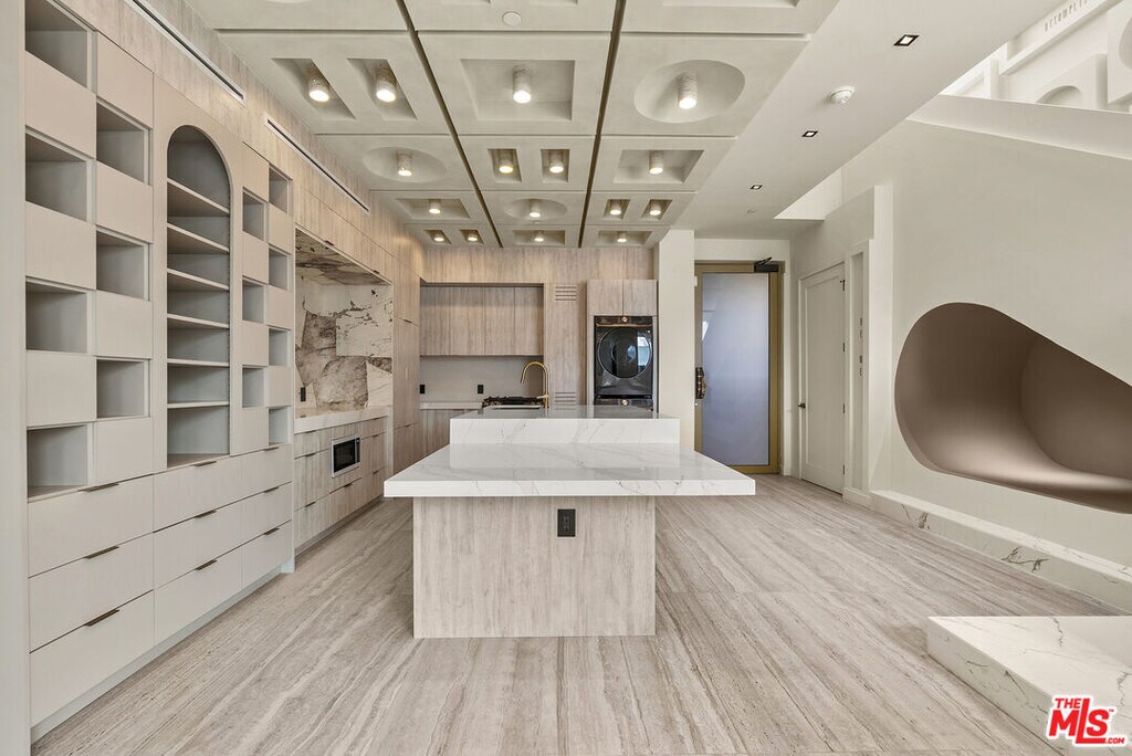 Welcome to The Ivory Atelier, a one-of-one architectural residence. A never before lived in one bedroom, 1.5 bath home within the newly completed Limited Edition building, defined by a serene European stone palette, sculptural architectural detailing, and integrated modern functionality rarely found in lease offerings.The main living environment is anchored by the building's signature coffered ceiling with warm bronze lighting and a chef's kitchen wrapped in bespoke European cabinetry and veined stone surfaces in soft ivory and dune tones. Quartz and stone countertops extend into a sculptural peninsula with integrated seating, creating a seamless entertaining composition.Walls are finished in ceramic and floors in porcelain, with the majority of tile selections sourced from premier manufacturers in Italy and Spain. The primary suite is paired with a refined spa bath finished in glossy ivory mosaic tile and warm stone textures, layered in soft mineral tones with sculptural lighting and matte black fixtures. The result is a boutique hotel composition that feels calm, elevated, and distinctly modern within the collection. Expansive glass doors extend the residence to a 134 sqft private outdoor terrace, creating a rare indoor outdoor living experience for a one bedroom home ideal for dining, lounging, or entertaining. Delivered brand new, The Baikal Ivory Atelier represents a more restrained and serene architectural expression where soft stone, subtle texture, and sculptural form define a refined living environment within this limited design collection. A collectible residence within the Limited Edition development defined by bespoke design, European materials, and sculptural living. MLS# 26671901
