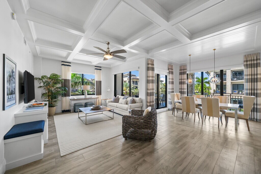 An exciting new concept of living has arrived in Olde Naples! Naples Square boasts the newest and most luxurious level of mid-rise condominium residency within the heart of the Naples area. This fabulous residence is furnished in a contemporary design scheme with accents of Florida colors as well as equipped with all modern features. Solid surface flooring throughout all living areas with area rugs gives the impression of clean lines. Sofa and two chairs in the living room. The glass dining room table seats four plus there are four bar stools at the breakfast bar. This residence also boasts a long open balcony overlooking the City street area. Every creature comfort has been provided to make a tenant's stay more convenient and enjoyable. Enjoy the amenities Naples Square has to offer including a heated pool & spa,exercise room,social room,BBQ grills,secured lobby access and on-site manager. Conveniently located close to 5th Avenue South shopping & dining district offering fine shopping,dining and entertainment.