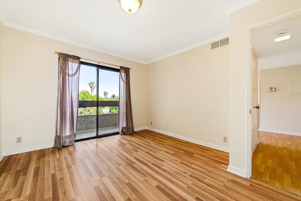 This inviting top-floor view condo blends modern style with comfort and serenity. Featuring an open-concept floor plan, freshly painted walls, sleek laminate flooring, a new washer, and contemporary recessed lighting, it offers a bright, tranquil ambiance throughout. Enjoy two private balconies—one off the main living area and another from the primary bedroom—perfect for soaking up the California sunshine and taking in breathtaking city vistas. Meticulously upgraded with modern fixtures and finishes, this home provides ample storage, a dedicated laundry space, and side-by-side parking spaces. Nestled within a well-maintained, quiet complex in a highly desirable neighborhood, it offers the perfect balance of peaceful living and urban convenience.