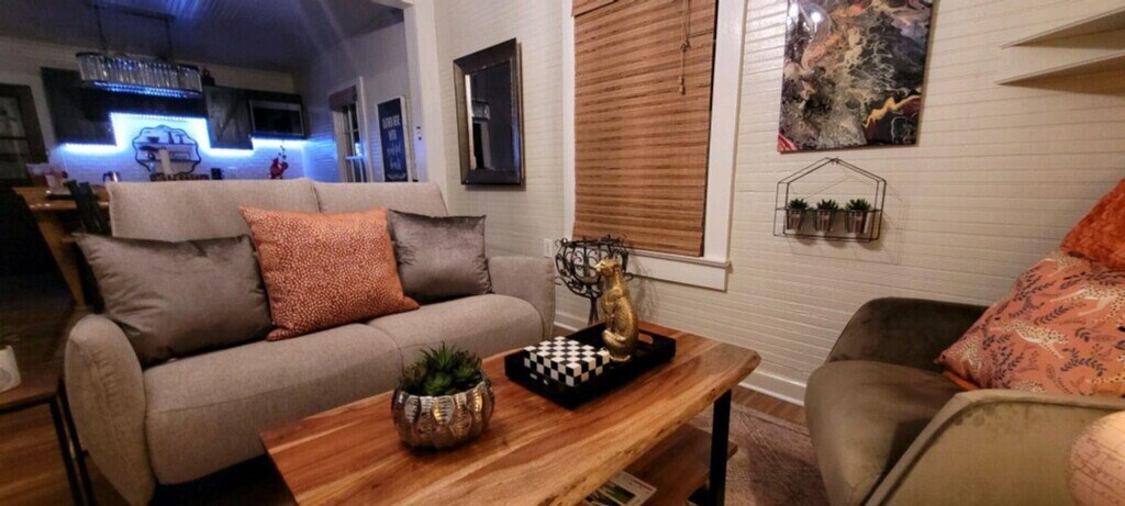 This charming old millhouse has been transformed into a modern-day farmhouse with barn doors, perched atop a hill. Just 1.7 miles from Frank Howard Memorial Stadium, this home is adorned with Clemson memorabilia, making it a true gem for any Tigers fan. This unique Clemson farmhouse features hardwood and tile floors, tiny home appliances, a day bed with a trundle, and a queen bed, comfortably sleeping four. The light-filled, spacious home includes a fully equipped kitchen with all the essentials for a delightful home-cooked meal and a backyard for relaxation. The property offers free parking on the premises for up to two cars. Located close to local attractions such as the South Carolina Botanical Gardens, Memorial Stadium, Bob Campbell Geology Museum, Larry W. Abernathy Waterfront Park, and the Clemson Area African American Museum, this home offers a convenient base for exploring the area. Guests must be at least 21 years old to make a reservation, and a State Identification Card or Driver's License copy will be requested upon booking. Smoking is prohibited in the house and on the balcony, with a $1000 fine plus cleaning costs for violations. No parties or events are allowed, with fines ranging from $200 to $500 for violations. Pets are not allowed, with a $200 fine for violations. The home is suitable for children and infants. [SI]