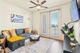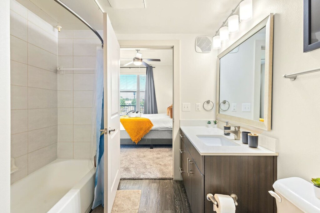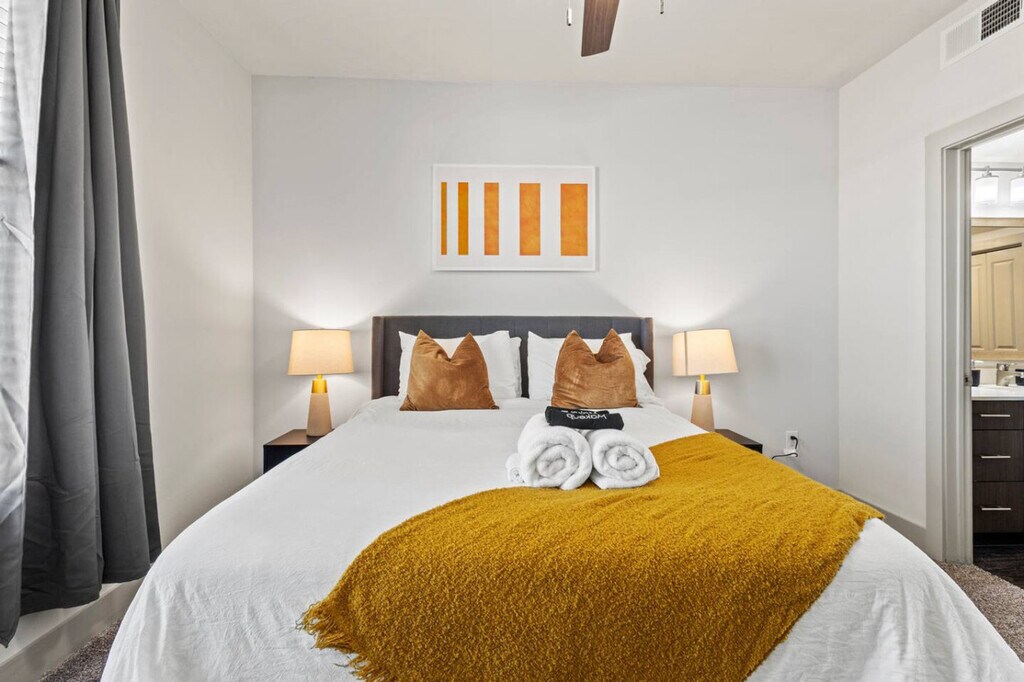Feel at home in this warm and inviting 1-bedroom suite. This apartment offers cozy charm with a private balcony. This apartment features a curated espresso bar, a spa-like bath, a Smart TV, laundry, and a fully stocked kitchen with new appliances, including a refrigerator, dishwasher, microwave, oven, and stove. The kitchen also has a coffee machine with a milk frother, mugs, and filters, a hot water kettle, tea bags, a spice rack, a toaster, oil, salt, sugar, cookware, utensils, plates, glasses, and basic cooking supplies. The bathroom has a full-sized shower with shampoo, conditioner, and body wash, fresh towels, washcloths, hand towels, and a hairdryer. Enjoy resort-style amenities including a pool, outdoor cabanas, a 24/7 fitness center, work areas, and a stylish lounge. Complimentary garage parking is available for one vehicle with a reserved spot in a secure parking garage. Visitor parking is also available for extra vehicles. A high chair is available. With quick access to I-75, rail, food spots, a hospital, shops and nature trails, this apartment is ideally located. Nearby attractions include the Dallas Medical District (approximately 10 minutes away), Whole Foods Market (approximately 3 minutes away), Dallas Love Field Airport (approximately 12 minutes away), Dallas Market Center (approximately 10 minutes away), American Airlines Center (approximately 10 minutes away), Perot Museum of Nature and Science (approximately 10 minutes away), Klyde Warren Park (approximately 9 minutes away), Dallas Museum of Art (approximately 10 minutes away), Dallas World Aquarium (approximately 11 minutes away), Dallas Zoo (approximately 15 minutes away), AT&T Stadium (Dallas Cowboys) (approximately 22 minutes away), and Globe Life Field (Texas Rangers) (approximately 22 minutes away). Travel times are approximate and can vary based on traffic conditions. Any violation of the no-parties policy will result in immediate eviction, no refund, and a $500 fine, and police involvement. A $500 fee will be charged for smoking inside or anywhere on the property. Quiet hours are from 10:00 PM to 7:00 AM and are strictly enforced. Evidence of pets inside the property will result in a $150 fine. A quick background check is required for the primary guest. All access to this apartment is digital, and a smartphone is required for entry. A lockbox and key are available as a backup option. This is a residential building with full-time residents, so please be respectful of their space and follow all property rules. One reserved parking spot is available per stay using the parking pass. Additional vehicles will need to be registered with the building. A $50 per hour penalty will be applied if you fail to check-out by 10 am or by the agreed upon check-out time. There is a $100 charge if the fob or parking pass are not returned to the lockbox, as a replacement cost ($200 if both are missing). Includes a workstation with a desk, an ergonomic chair, and high-speed Wi-Fi. [SI]