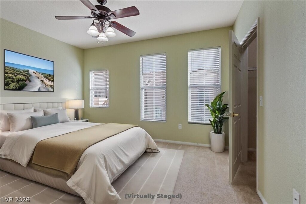 Lone Mountain resort-style gated community! 1,459 sq ft corner-unit condo with mountain views and a great floor plan featuring 3 bedrooms and 2 baths. Direct access attached insulated 2-car garage with storage and smart garage opener. Bright living area with high ceilings and plenty of natural light. The living room includes a mounted TV included with the property. Kitchen features granite countertops, modern hardware, pull-out shelving, and all appliances included. Private balcony with mountain views. Spacious primary bedroom with walk-in closet, double vanity, and separate tub and shower. Recent upgrades include a new AC, new water heater, and a whole-home King water filtration system. Community amenities include a pool, spa, fitness room, clubhouse, and scenic Las Vegas views. Professionally managed by Hudson Real Estate.