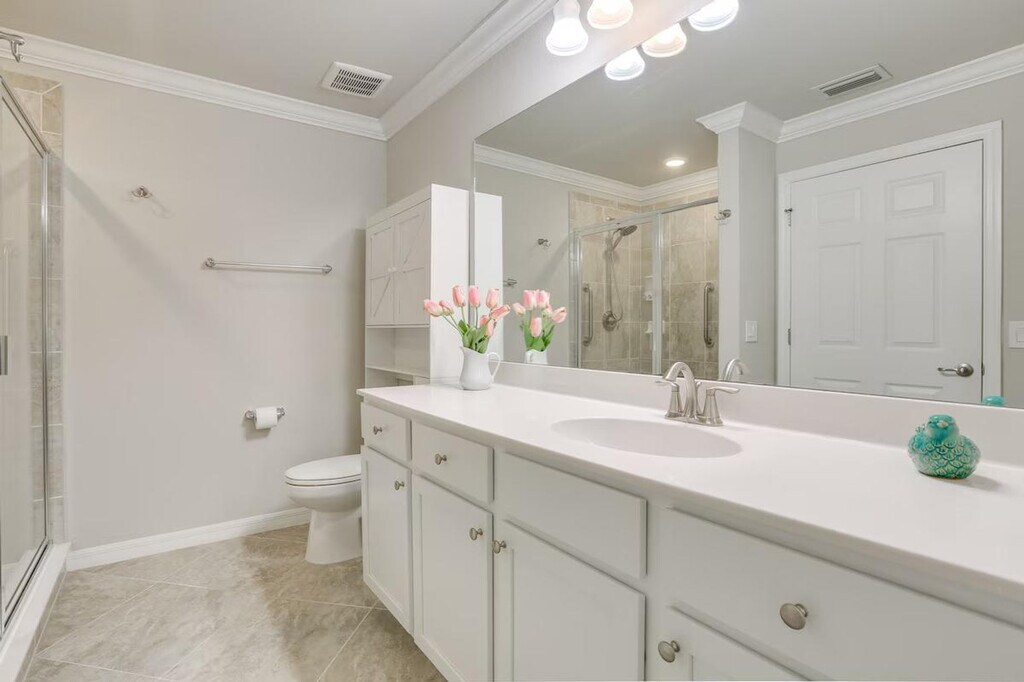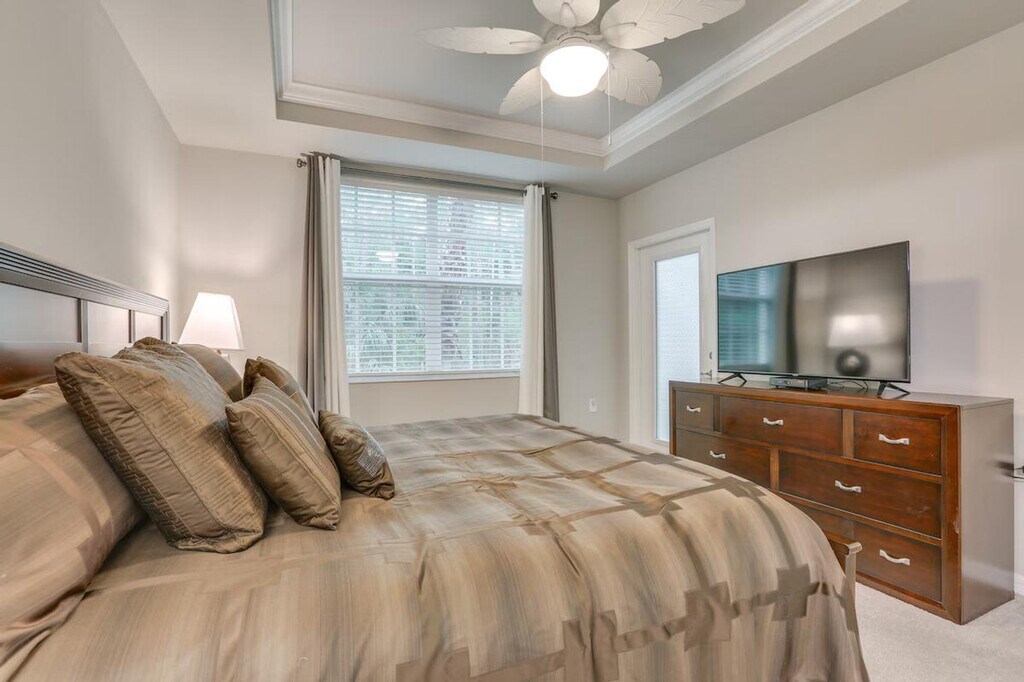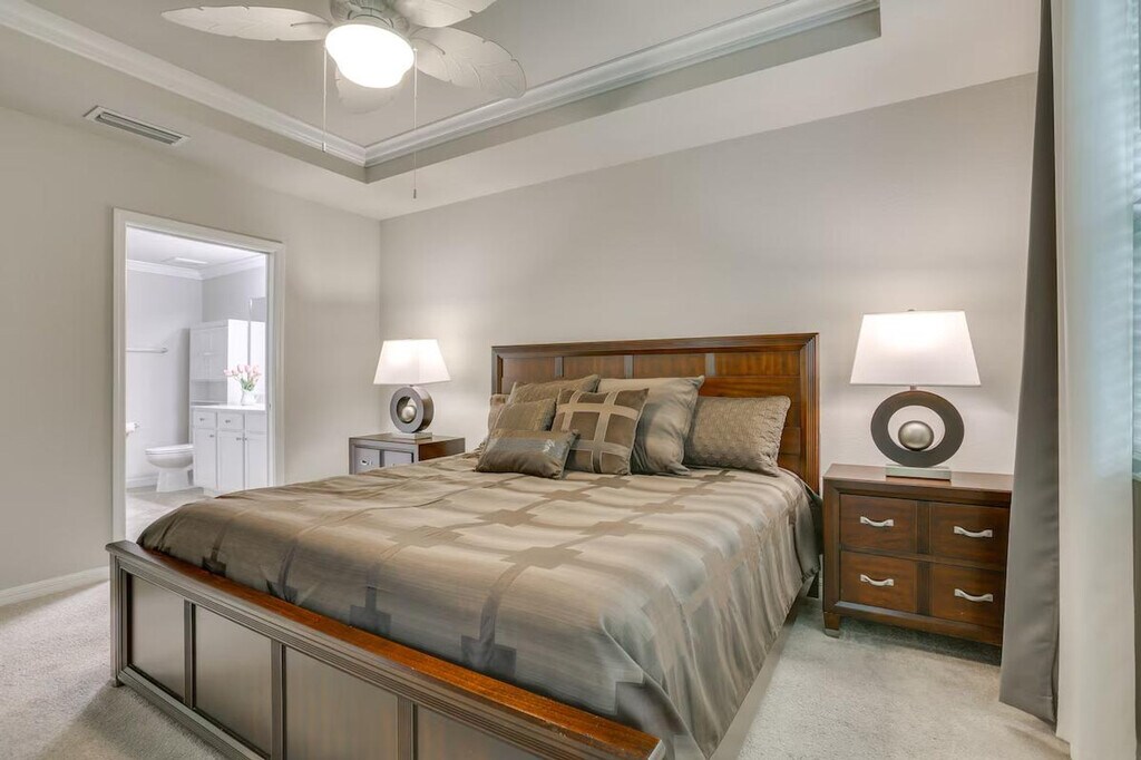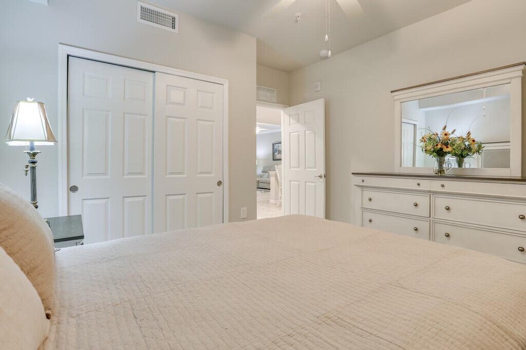 Feel at home in this 1st-floor, single-story condo in Fort Myers, located in a gated 55+ community with elevator access. This 2-bedroom, 2-bath apartment in Palazzo at Pelican Preserve blends peaceful surroundings with vibrant community culture and requires one small step to enter. This apartment features a screened-in patio with seating, smart TVs with cable, a Sleep Number bed in Bedroom 1, a dining table, and an open floor plan. The kitchen is equipped with a refrigerator, stove/oven, dishwasher, drip coffee maker with starter coffee provided, toaster, cooking basics, dishware and flatware, an ice maker, and trash bags/paper towels. You'll also have access to central heating and A/C, a washer/dryer, laundry detergent, linens/towels, complimentary toiletries, a hair dryer, and free Wi-Fi. Pets are welcome with a $50 fee, and designated carport parking for one vehicle is available, along with a community parking lot on a first-come, first-served basis. Lounge by the sparkling pool or stroll along Sanibel Island's shores. This is a 55+ community. There is no smoking, events, parties, or large gatherings allowed. Must be at least 18 years old to book. Photo ID may be required upon check-in. [SI]