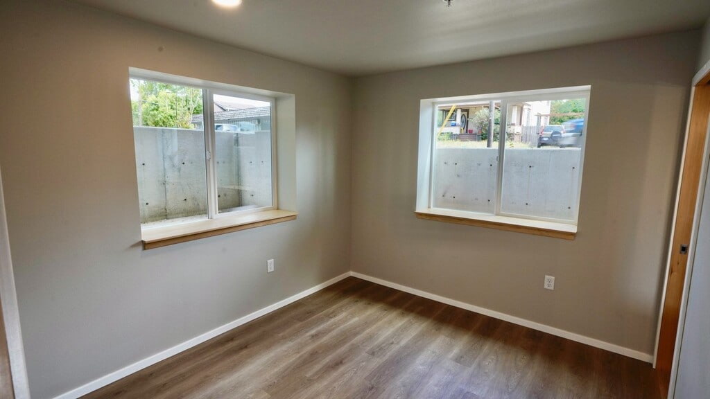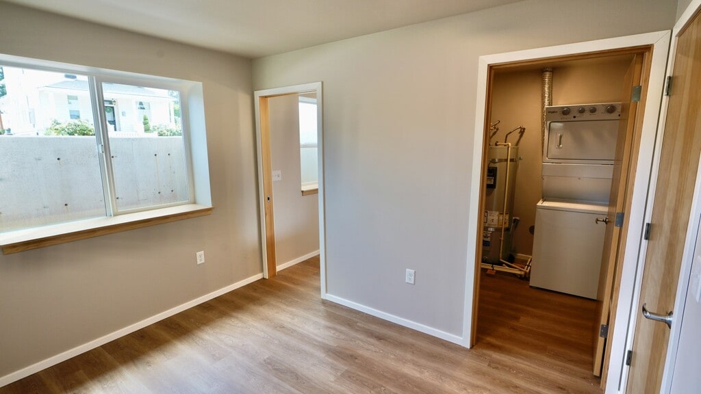 This basement unit features full size windows that create a feeling of being above ground level, in-unit laundry with machines provided in the walk-in closet, parking in the private lot & on-street, built-in heating & AC via a high efficiency mini-split unit. Images do not show high end roller shades installed in each window. Rent includes water & trash; electricity & internet (Ziply fiber) are tenant responsibilities.