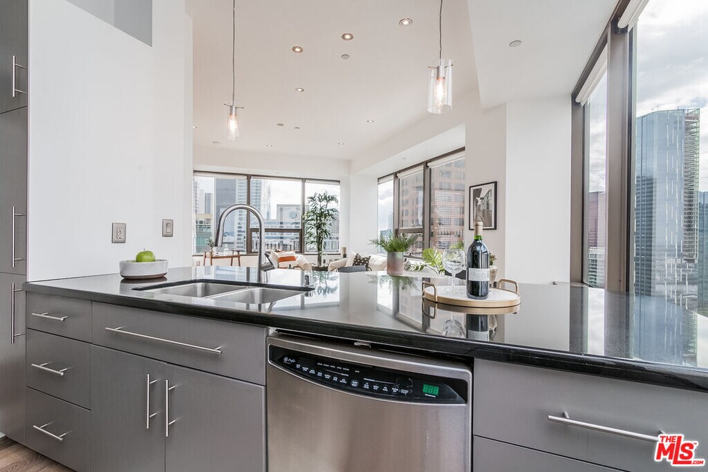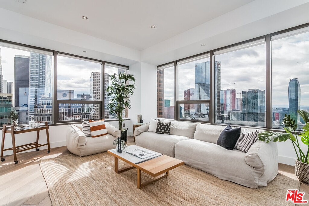 A rare corner loft suite on the 22nd floor offering sweeping southwest facing panoramic views of the Downtown LA skyline, LA Live, the Westside, and the resort style sky deck with pool. The flexible den functions perfectly as a breakfast nook or home office. The modern European style kitchen features upgraded appliances, granite countertops, and elegant cabinetry, complemented by wood floors throughout. A glass partition subtly separates the living and sleeping areas while maintaining an open airy loft feel. Additional highlights include an in unit LG washer and dryer, a spacious bathroom with storage, and two side by side parking spaces. Residents enjoy resort quality amenities, including a 17th floor sky deck with a heated infinity pool, spa, cabanas, lounge beds, wet bar, BBQ grills, and a fire pit lounge area. The building also offers a fully equipped fitness center, media and screening room, business center, and 24 hour concierge, security, and on site management. Located just moments from LA Live, Arena, the Convention Center, public transit, restaurants, and major freeways, this corner unit combines exceptional design, bright and open living, and the very best of downtown lifestyle. MLS# 25571337