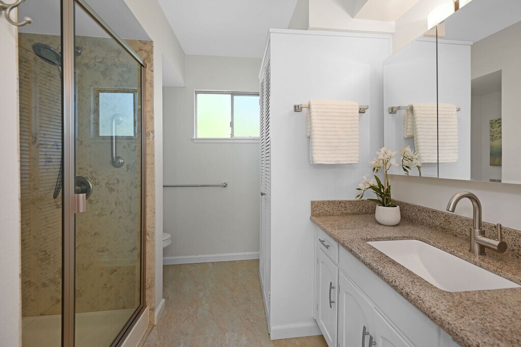 Are you looking for a Level-In unit which includes an entrance with no stairs? Do you need easy access from the carport to your home? Welcome to this beautifully updated, end-unit nestled in a peaceful location in the heart of Rossmoor. Enjoy the best of indoor-outdoor living with two private patios—one bathed in sunshine, perfect for gardening, and the other shaded for relaxing afternoons. Make your way inside to a tastefully renovated Carmel Floorplan interior featuring a brand-new kitchen with quartz countertops, marble backsplash, and wonderful cabinetry with under-cabinet lighting. The kitchen and entryway are finished with stylish ceramic tile, while new luxury vinyl plank flooring flows throughout the rest of the home. Crown molding and updated lighting add a refined touch. The bathroom has also been thoughtfully remodeled and includes an in-unit washer and dryer for added convenience. Freshly painted and move-in ready, this home offers easy level entry through the sliding door just beyond the guest parking and the carport. There’s also a charming rear pathway accessible from the back patio. Additional highlights include extra storage, a serene setting, and lots of Rossmoor amenities; pool, library, movie theatre, pickleball and more!