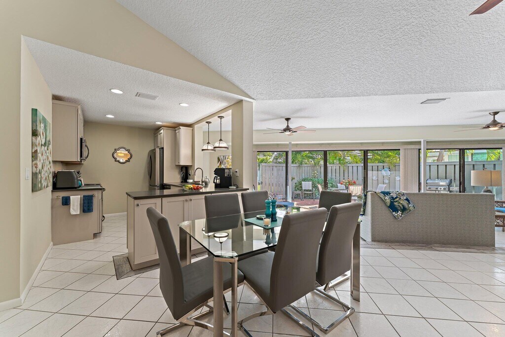 Gorgeous beachside villa in Bella Vista! Beautifully upgraded and furnished, two bedroom, two bath, one level, turnkey unit located in this sought after, private/security monitored community. Amenities include alarge clubhouse with heated pool, tennis, pickleball, racquetball, and bocce courts. Split plan with upgraded kitchen appliances and furnishings. Private fenced in patio with al fresco dining area and barbecue. King size bed in primary suite, queen size in guest bedroom. Two designated parking spaces. Steps to the pristine Jupiter beach, Seabreeze amphitheater and heart walk trail. Numerous restaurants, shopping and entertainment. Available off-season, $3800 starting May 1, 2025 through November 30. Seasonal, $7800, starting December 1, 2025-April 30, 2026.
