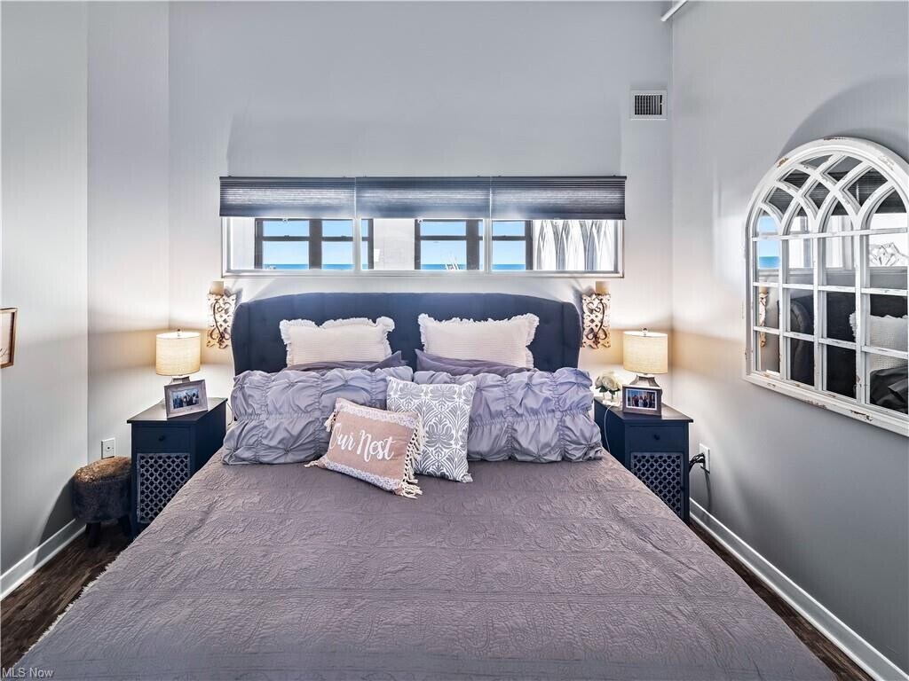 Just minutes from the east bank of the Flats, this lakefront condo in Cleveland's Historic Warehouse District boasts the best location in downtown Cleveland! This 2-bedroom, 1-bath loft condo with soaring, 12' ceilings features oak hardwood floors, a formal foyer with gallery space, and an open floor plan with large windows, allowing ample natural light and unobstructed Lake Erie views. The modern kitchen includes stainless steel appliances, granite countertops, and a spacious kitchen island. Recent upgrades include a large walk-in shower, hot water tank, a high-efficiency HVAC system, west facing black out remote-controlled blinds, custom fitted “window warmers” in all north facing windows (eliminates drafts off of Lake Erie), and a Nest thermostat. In addition to over $20K in new upgrades, the owners are also including an electric fireplace, bar stools and 50in smart TV. The in-suite laundry hookups and generous closets add to the comfort and functionality of the space. Additional amenities include keyless entry, a fitness center, a rooftop deck, and attached gated off-street parking. This location is a short walk to Cleveland’s finest waterfront restaurants and shops, grocery, and sporting venues. Unit comes with 1 parking spot in the attached, gated off-street surface lot for $120/month. Tenant pays for electric and internet/cable.