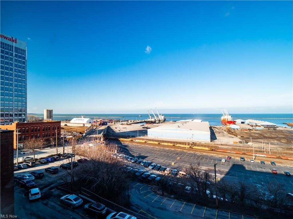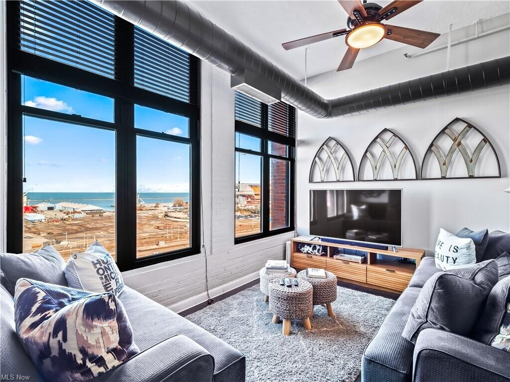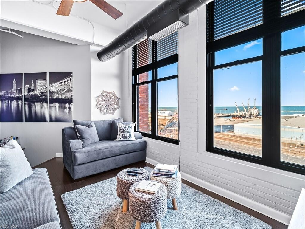 VIEWS!!! Absolute GEM in Downtown Cleveland with FABULOUS water and stadium views. In addition to gorgeous updates, this condominium comes fully furnished!!! The home has been modernized with new flooring in the in bedrooms, solid wooden doors, new hot water tank (2023), all new beautiful light fixtures. You'll love the home's tall ceilings, sleek flooring, and neutral colors throughout. The kitchen offers upgraded flooring, stainless appliances, ample cabinet space. The living room, with an updated ceiling fan, is situated on a raised level to showcase the fantastic scenery. The primary suite has an ensuite full bath, with refreshed tile, lighting & vanity, and adequate closet space. The roomy second bedroom boasts 2 large windows and is located next to the guest bath with new lighting. This condo is just perfection. Washer & dryer hookups are located in the closet near the front door. The building has an amazing rooftop deck with panoramic views of the City and has a workout room. Wonderful Warehouse District location, just steps from the East Bank of The Flats, grocery stores, nightlife, amazing restaurants! Move right into this perfect home in the City.