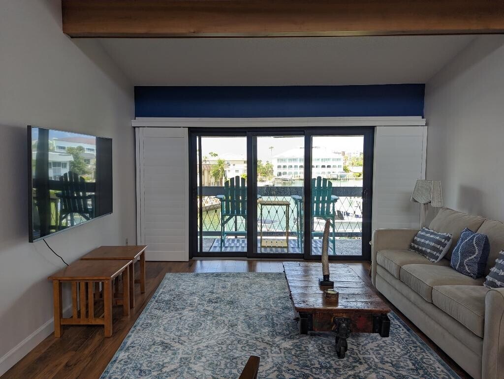 FALL SPECIAL: $3,000 a month November and December. Sold out Jan., Feb. and March. $4,000 a month for April. Weekly and annual rates available upon request. GET OUT OF THE COLD, FRIENDS UP NORTH, AND RENT THIS CONDO WHILE YOU STILL CAN! ENJOY PARADISE ON THE ISLE OF CAPRI DURING THE BEST TIME OF YEAR TO WALK THE BEACH AND BATHE IN OUR SUBTROPICAL CLIMATE WITHOUT THE HIGH HUMIDITY OF SUMMER. Tastefully furnished two-bedroom, two-bathroom condominium apartment in an elevator building. The unit offers million-dollar water views from the living room, master bedroom, balcony and outdoor lounging area. Unlike many rental units, this one is not an owner-occupied apartment. You won't feel like you are living in someone else's home, full of their stuff. Our apartment is designed especially for renters -- fully equipped and plenty of empty closets for your exclusive use. A swimming pool as well as dozens of palm and coconut trees and flowering tropical bushes create a park-like setting in the large, sprawling yard, which sits above a natural canal visited by dolphins and manatees. Relax in this quiet, peaceful setting that is just a 10-minute kayak paddle to bustling John's Pass, Boca Ciega Bay and the Gulf of Mexico. Inside your updated apartment on the top floor of a 16-unit, elevator building, enjoy the comforts of a bright large open-concept kitchen-dining-living room combination featuring a vaulted ceiling accented by natural wood beams. The two ensuite bedrooms are nestled off to the side. The great layout includes an in-unit washer and dryer. Rent includes covered parking and water. Annual tenant pays for electricity and WiFi/cable options. No smoking. Renters are not allowed to own pets, per homeowner association rules. This is a highly desirable building on the Isle of Capri, situated across from Rosselli Park (tennis and pickleball courts and a baseball field), and a 5-minute walk to Treasure Island Beach and restaurants on Gulf Boulevard.