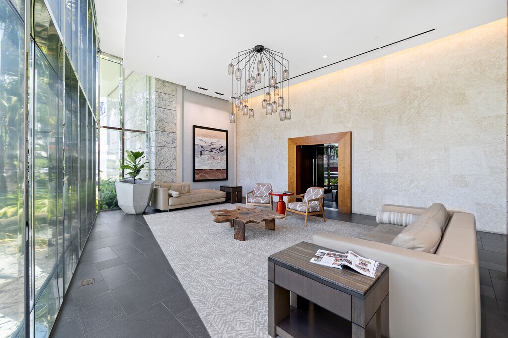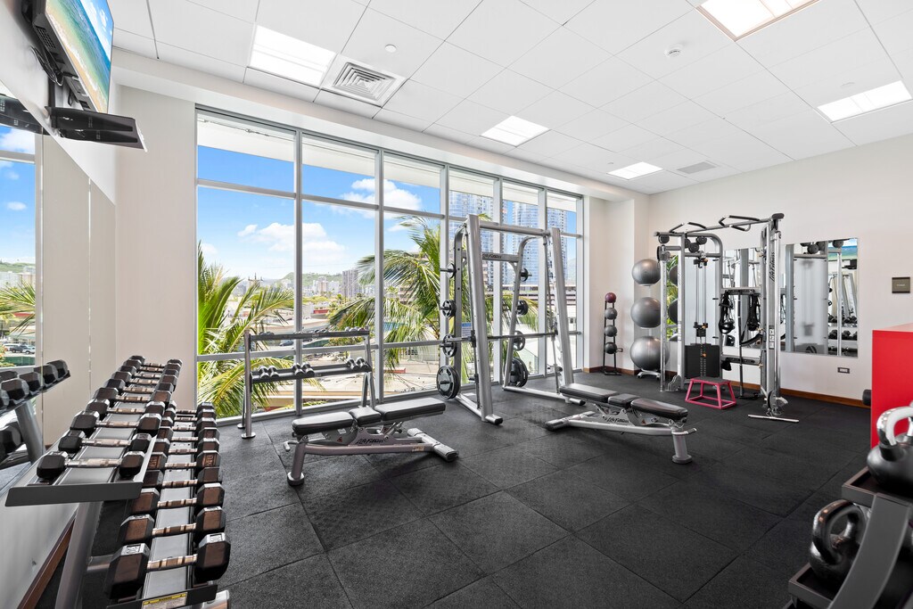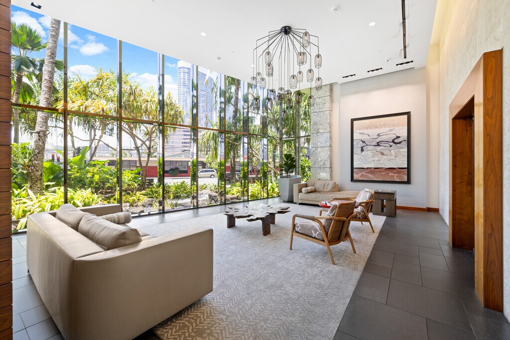 This sleek and modern Waihonua unit is elegantly appointed with matte-finish walnut wood flooring, mahogany-stained cabinetry, stone countertops, Bosch kitchen appliances, and window shades. This secured building is conveniently located within walking distance of Ala Moana Shopping Center, Ala Moana Beach Park and Ward Village. Amenities include an infinity pool, spa, BBQ pavilions, club room with full kitchen, fitness center, resident's movie theater, two guest suites and surfboard and bike storage.