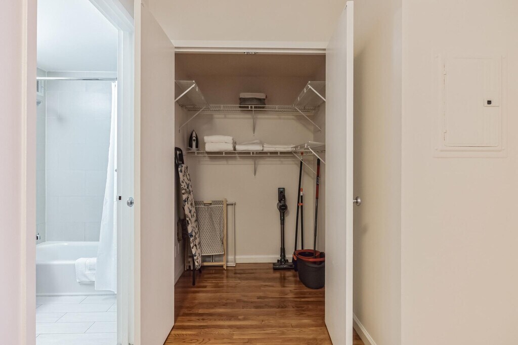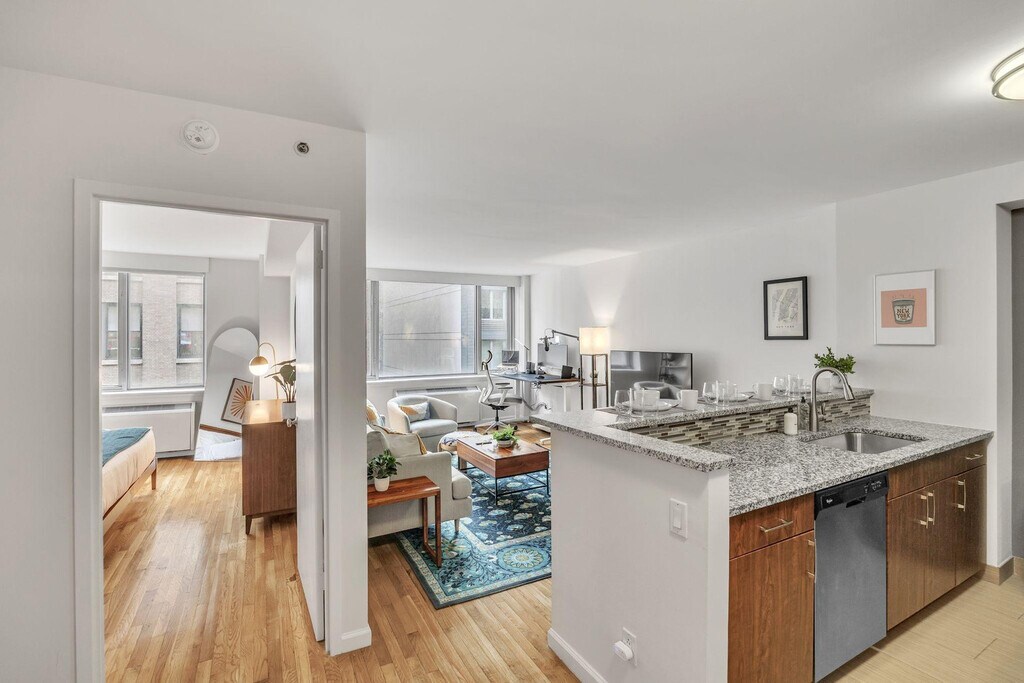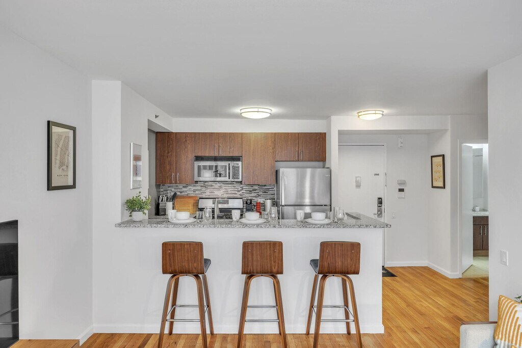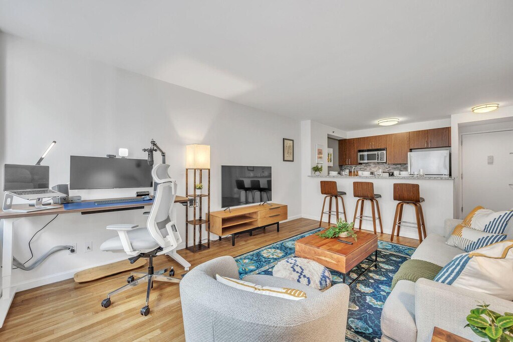 Feel at home in this spacious 1-bedroom apartment in the heart of Manhattan's historic Chelsea district, nestled on a quiet block between 6th and 7th Avenues. The building has elevators and a 24-hour door attendant. This fully furnished apartment is specifically designed for remote workers and professionals. It includes a king-size mattress, a full bathroom, a fully equipped kitchen with stainless steel appliances (including dishwasher) and an Illy coffee machine with pods, a breakfast bar, a smart TV, hardwood flooring, spacious closets with built-in storage, and on-site laundry. Amenities include a fitness center, community lounge, and rooftop sundeck with city views, TV, and BBQ. Professionally managed parking is available on-site (not included). Steps from world-class shopping, dining, and entertainment, you'll be within walking distance of famous sites such as The Highline, Madison Square Garden, The Whitney Museum, and Broadway. Internet speeds are not guaranteed and may fluctuate based on your computer model and the router location. A laptop computer is not included in the home office set-up. The building is currently undergoing renovation and is expected to continue until January 2026. Includes private high-speed internet, an Uplift standing desk, an Uplift work chair, a 34-inch ultra-wide Samsung monitor, a Blue Yeti microphone, a Logitech webcam, computer speakers, an LED streaming light, a green screen, a Logitech keyboard, a Logitech mouse, a laptop stand, and a TOTU 16-in-1 Triple Display USB-C 3.1 Docking Station. [SI]