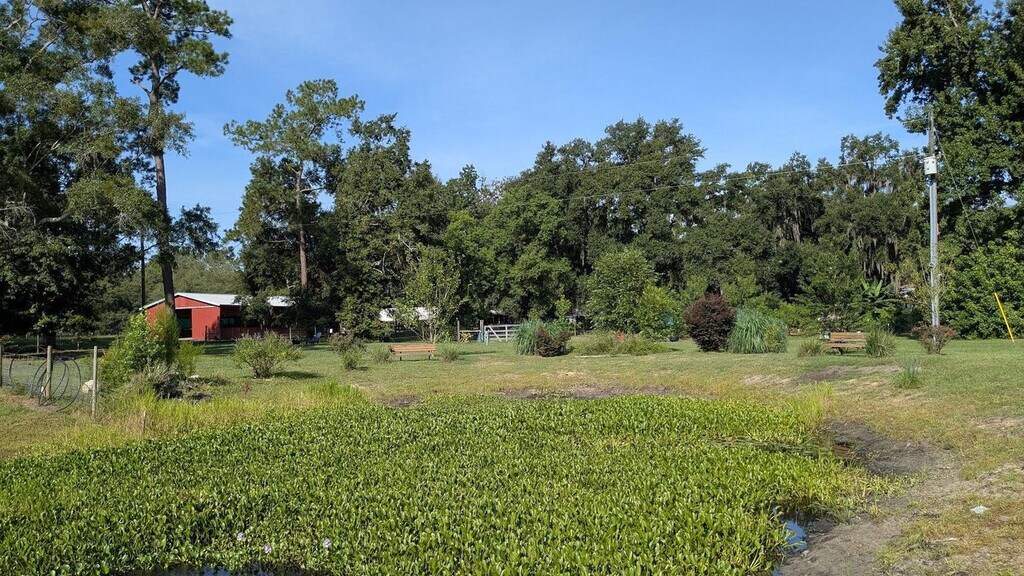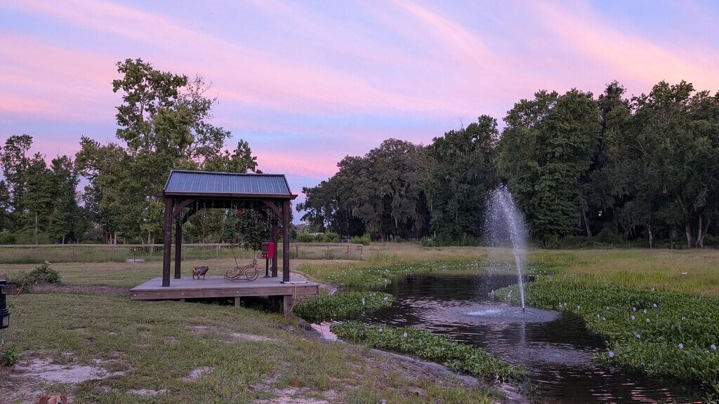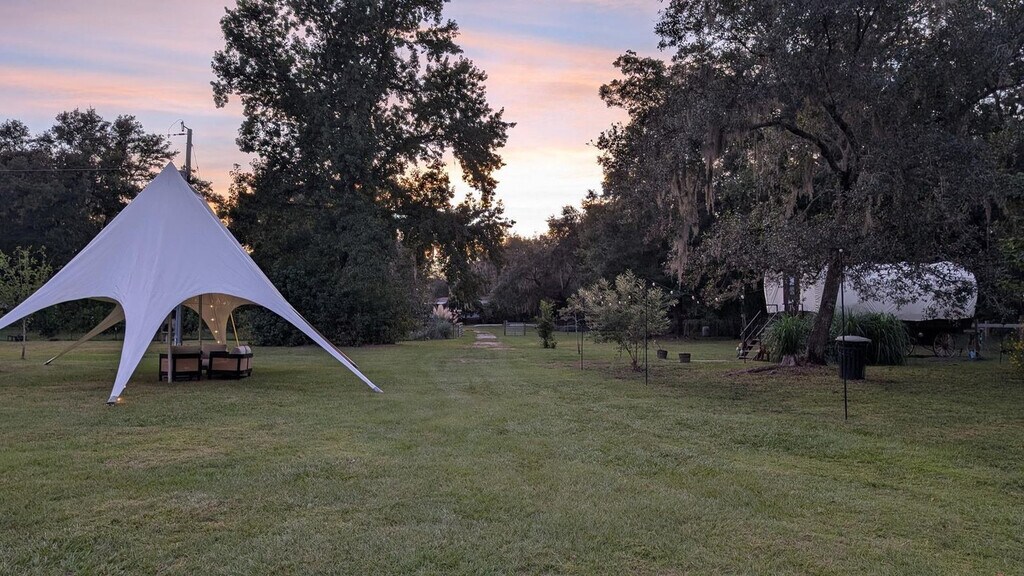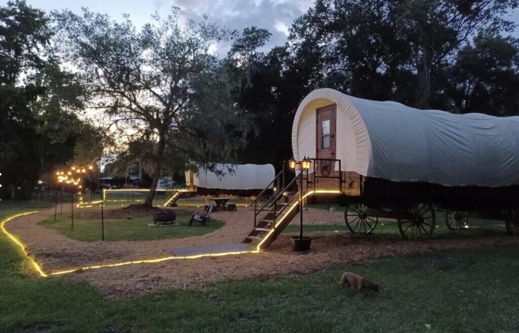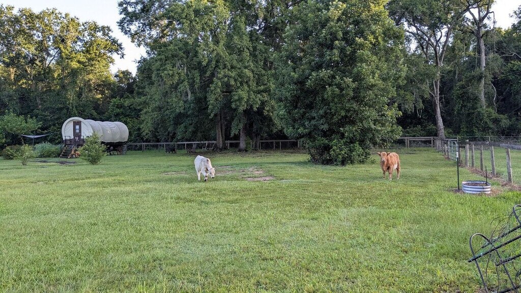 Feel at home in this luxurious 1800s-style covered wagon, offering a charming blend of rustic history and modern comfort. Surrounded by rolling farmland and rescue animals, it’s the perfect place to unwind and reconnect with nature. Your wagon features a king-size bed, A/C and heating, Wi-Fi, a mini fridge, microwave, toaster, and coffee maker for simple, cozy meals. The private bathroom offers a hot shower, fresh towels, and toiletries. Thoughtful touches like board games and room-darkening shades make your stay extra comfortable. Outside, relax in your private fire-pit area with seating and BBQ grill, perfect for stargazing or roasting s’mores under the Florida sky. Guests can also enjoy shared areas like the gazebo and picnic space. For safety, the pasture with the cows and horses is restricted. Enjoy luxury glamping with a private fire pit (firewood $15) and cozy seating. Try the guest-favorite Cow Cuddles for $95 (regular $129) and enjoy 15% off gift-shop purchases. Located just minutes from Keystone Heights and Melrose, you’ll find lakes, cafés, and small-town charm nearby. Quiet hours are 8 PM – 8 AM. Smoking on the property incurs a $300 penalty and dismissal from your rental without a refund. A $250 penalty applies if noise level, parties, or other obscene behavior requires a police callout, and you will also be dismissed from the property without a refund. Leaving trash outside the entrance to your property incurs a $100 penalty. Check-in is any time after 4 PM and check-out is at 10 AM. A late check-out without authorization will lead to a night-rate cost penalty. Parties are prohibited. Front porch, spacious yard, and serene scenery. Please do not throw trash or paper towels or toilet paper in the toilet to avoid clogging. Please use the trash can. Damage to the interior of the property or common areas will result in a pro-rated auto-chargeback from your booking account. On checkout please turn off the lights, the A/C unit, water, and gas/stove, and lock the door behind you. [SI]