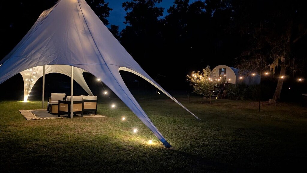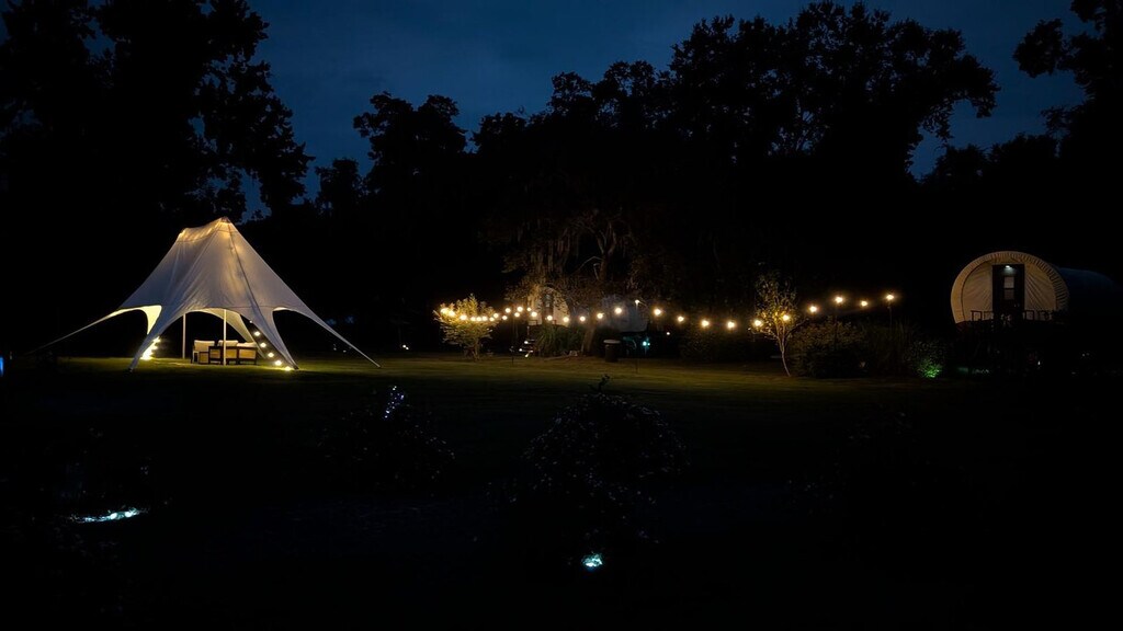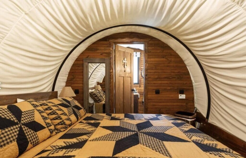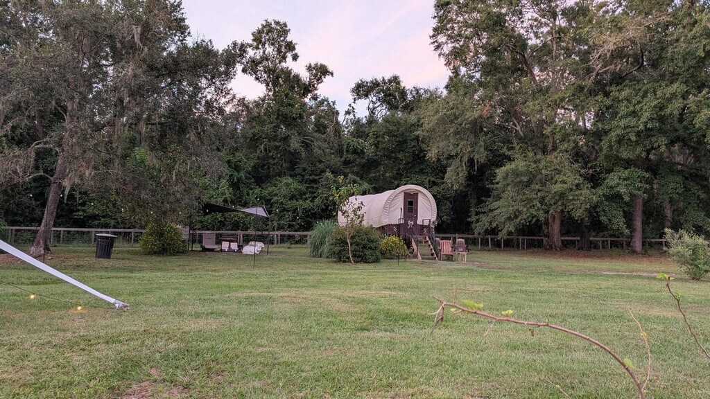 Experience a unique stay in a luxury 1800s-style covered wagon on a peaceful Florida farm and feel at home. Perfect for couples or small families, the wagon offers a cozy retreat surrounded by peaceful farmland and friendly rescue animals. Inside, you’ll find a king-size bed, air conditioning, heating, Wi-Fi, a microwave, mini fridge, toaster, coffee maker, and dining table. The private bathroom features a hot shower, fresh towels, and essential toiletries. Thoughtful touches like board games and room-darkening shades ensure comfort day and night. Step outside to your private picnic area with seating, fire pit, and BBQ grill—ideal for roasting s’mores under a star-filled Florida sky. Enjoy access to a shared gazebo and lounge chairs, or stroll the scenic property to meet the resident cows, horses, and other rescued farm animals. Pasture areas are restricted for safety. Enjoy farm access for $95/day and a Cow Cuddle Session for $95 (regular $129). Firewood is available for $15 with starter log and color pack. Just minutes away, explore the lakes and small-town charm of Keystone Heights and Melrose—ideal for kayaking, dining, and local markets. Check-in is any time after 4 PM, and check-out is at 10 AM. Quiet hours are from 8 PM to 8 AM. There is a $300 penalty for smoking on the property, and you will be dismissed from your rental without a refund. There is a $250 penalty if noise level, parties, or other obscene behavior requires a police callout, and you will be dismissed from the property without a refund. There is a $100 penalty for leaving trash outside the entrance to your property. Damage to the interior of the property or common areas will result in a pro-rated auto-chargeback from your booking account. This property is pet-free. Your stay includes free parking and access to the on-site gift shop with a 15% discount (use code STAY). Please do not throw trash, paper towels, or toilet paper in the toilet to avoid clogging. On checkout, please turn off the lights, the A/C unit, water, and gas/stove, and lock the door behind you. [SI]