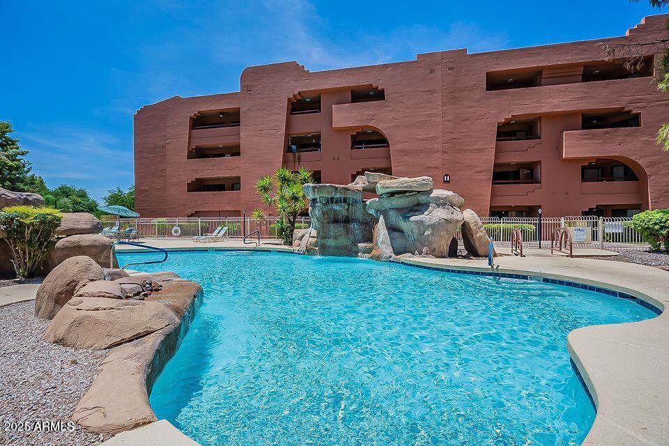 You will love this resort-style haven that promises tranquility! The serene location offers scenic views of lush walking paths,towering trees,and a fabulous pool and spa complex complete with delightful water features and charming waterfalls. Spacious rooms,beautiful neutral tile throughout,ceiling fans,soaker tub/shower,2 closets plus laundry area await. You'll love the convenience of an elevator and gated parking. Anasazi is renowned for its impressive amenities,including 5 pools & spas,a full fitness center,22+ acres of greenery. Enjoy leisurely strolls along the walking paths,relax on the seating areas or explore the stunning cactus garden perfect for quiet relaxation and lively gatherings. The clubhouse,a hub of activity,offers a fitness center,yoga,bingo,pool,ping pong as well as meeting rooms with a fully furnished kitchen,wi-fi and business area. Walk to Target,Costco,the library,restaurants and the new PV reimagined (high end dining,entertainment and retail). Embrace the convenience and luxury of this exceptional oasis that caters to all your lifestyle needs.