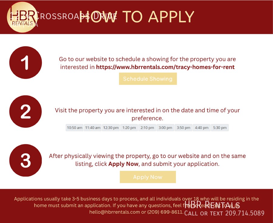 Description Rent: $2750 Pets: No Pets Deposit: $2750 Yard Care: Maintained by owner Utilities: Maintained by resident Built: 2000 For the fastest service, please visit find the property, click “SCHEDULE A SHOWING,” and request your preferred viewing time. Home Features • Bright and open floor plan with generous natural light • Formal living and dining areas • Spacious kitchen with ample cabinet storage • Comfortable bedrooms with large closets • Primary suite with private bathroom • Attached garage with plenty of storage • Convenient location near shopping, schools, parks, and commuter routes This beautiful home offers comfort, space, and a layout designed for easy everyday living. Enjoy a well-maintained property in a great Tracy neighborhood—perfect for anyone seeking a welcoming place to call home. This property is being offered for rent by HBR Rentals and will be fully managed by the property management company following tenant acceptance and placement. APPLICATION REQUIREMENTS • Application required from each applicant 18+ years old. • Excellent credit is required of each applicant. • Service animals and ESAs to be screened at • Meet company qualifying requirements. • Able to take possession of the property within 21 days of the availability date. • Must have excellent credit, employment, and rental history. • Favorable responses from references. • Evidence that the applicant has the financial ability to pay the rent along with their other obligations. • Proof of income showing a rent-to-income ratio of 3 to 1 in the form of pay stubs, W-2 forms, tax returns, bank statements, LES, or other documents. • Fully completed application from each applicant. We cannot process applications if information is missing or if not all applicants have submitted their applications. Incorrect/misinformation/missing information may delay the processing of your application or may disqualify you as a prospective renter. FEES AND INITIAL PAYMENTS • Application fee: $60/adult. • Lease admin fee: $50 due at signing. • First month’s rent: due at signing. • Security deposit: due at signing. • Available now! We operate on a first-come, first-served basis, prioritizing those who are first qualified. Instructions on how to Apply: All HBR Rentals residents are enrolled in the Premier Resident Package (PRP) for $50.95/month, which includes renters insurance, HVAC air filter delivery (for applicable properties), credit building to help boost your credit score with timely rent payments, $1M Identity Protection, move-in concierge service making utility connections, and home service setup a breeze during your move-in, our best-in-class resident rewards program, and much more! More details upon application. All verifiable sources of income will be considered. Pursuant to Cal. Govt. Code §12955(o), for applicants with rental vouchers or subsidies, the income threshold will be calculated based on the rent paid by the tenant (not the entire rent amount). DRE 0188547Dual Vanities Full Bathroom 1st Floor Tile Flooring Two Story