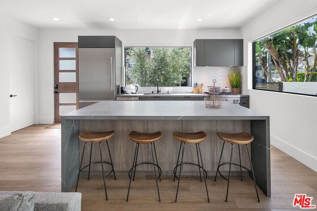 Enjoy a newly-constructed and modern townhouse in a central West Hollywood location. Walk through the front door and head up the stairs to the living space. Relax on the couch and put your drink down on the coffee table all watch your favorite streaming services and local channels on the flat-screened Smart TV. Cook a meal in the large kitchen with brand-new stainless-steel Thermidor appliances. Enjoy your food at the gorgeous kitchen island with bar stool seating for 4, or gather in the dining area with a dining table and seating for 6. Down the hallway you will find the Master suite with a King bed, spacious walk-in closet, Smart TV, and private balcony with lounge furniture. The attached Master bathroom offers dual sinks and a shower. To the right of the kitchen, you will find the second bedroom with a King bed, sliding closet doors, and attached bathroom with a sink and standing shower. Both bedrooms offer room-darkening shades to provide the best comfort and sleep possible. Head up an additional flight of stairs for shared rooftop access and the best Hollywood views. The unit offers garage parking for 2 vehicles and a washer and dryer. Recessed lighting and hardwood flooring through the home. Price above is for a one year furnished lease. MLS# 25615899