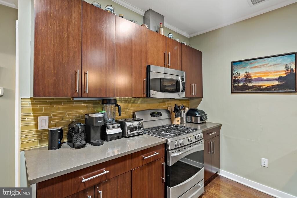 PARKING SPACE INCLUDED. Welcome to the Ice House, a LEED certified green building nestled in the hea of Fishtown. Boasting dramatic skyline views from the rooftop terrace and dog park, to more quaint inter koi pond views from your personal patio, you have the ability to feel like you re in the city, or miles away, a at the same time. This gated modern one bedroom one bathroom unit offers 674 square feet of open livi space and includes a deeded and gated garage parking spot on the first floor of the building. Enter the un by walking up to the second floor open-air courtyard, encompassed by the building on almost all sides, thereby acting as a sound-wall from the outside city noises. Scenic views of the courtyard are just the beginning as you enter into the unit through an oversized door, opening up to the living room and kitchen area, finished with dark oak hardwood floors, quartz countertops, a large island with ample seating, GE stainless steel appliances, flat panel bamboo cabinetry, a goose neck chef s faucet, modern farmhouse pendant lighting and a glass backsplash. In addition to the main room and kitchen area, the unit includes custom tile bathroom with a large all-glass shower complete with stone flooring, a large bedroom with ceiling fan, and a large walk-in bedroom closet. Top this all off with high-efficiency utilities such as a tan less water heater and a new LG stackable washer dryer set. Get to know the area, with some of Philadelphia s finest establishments just seconds away from your front door. Suraya, Philadelphia Magazine s #1 ranked restaurant, W. Mulherins and Sons, Fette Sau, Frankford Hall, Evil Genius Brewery, Goose Island Brewery, the Fillmore, Johnny Brenda s and many more are all just steps away! Other amenities include: Community locked package drop, individual locking mailboxes, an electronic locking bicycle storage room rooftop grill and bar communal rooftop terrace and communal rooftop dog park.