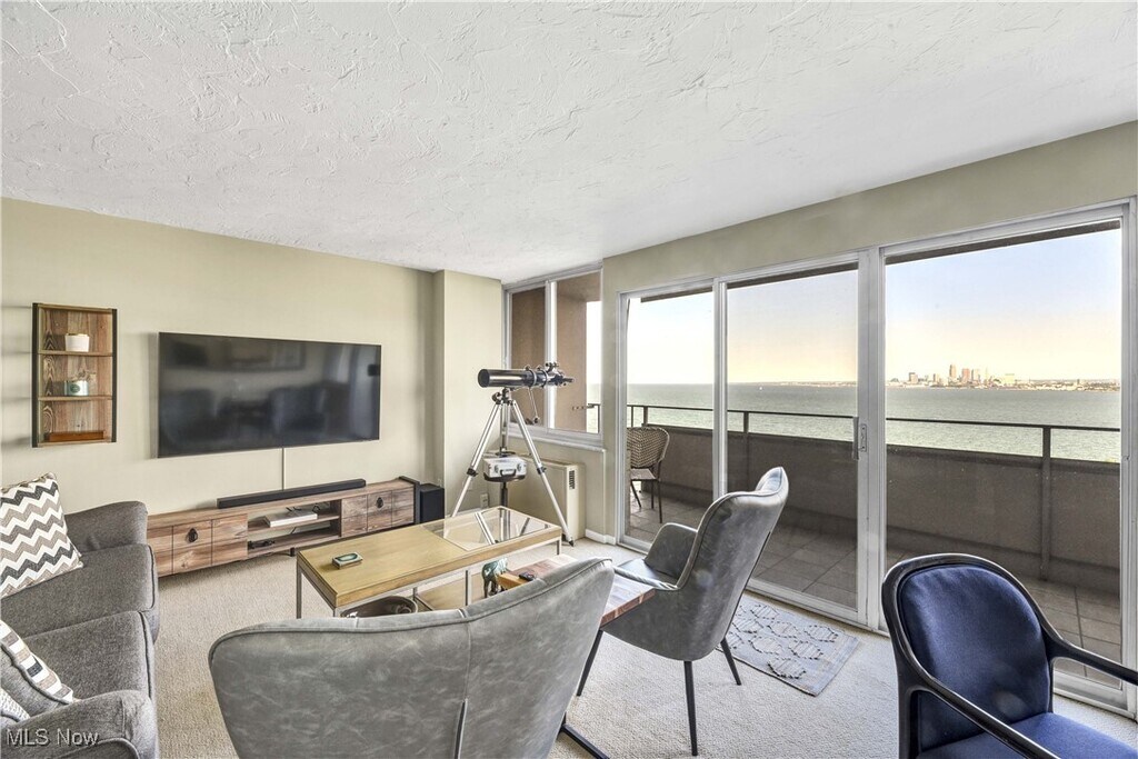 #1605 - Fresh and pretty furnished one bedroom with fantastic downtown skyline and Lake Erie water views from your private balcony. Nicely updated kitchen with kitchen featuring newer appliances and ceramic tile. Luxury vinyl plank flooring throughout Living Room,Dining Room and Hallway. Bedroom is carpeted. One heated garage space included. The Carlyle features a full complement of amenities including 24/7 reception/security/management,indoor and outdoor swimming pools,sauna,hot tub,two party rooms,fitness center,billiards/ping pong,laundry center,Boardwalk Market Deli,Summer Place Restaurant and more!