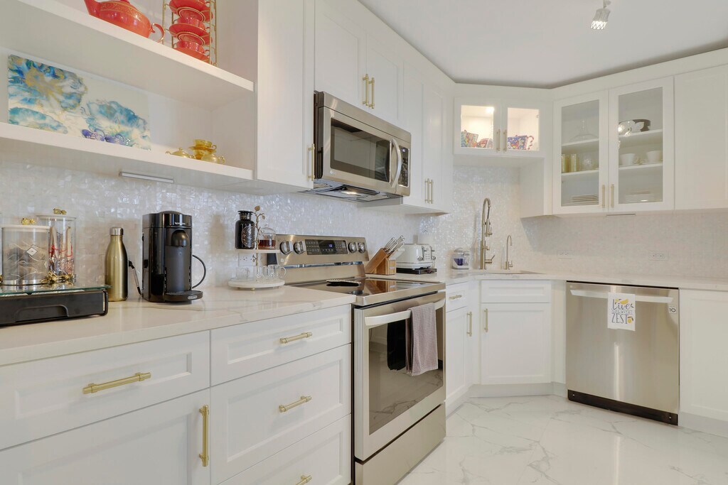 AMAZING WATER VIEWS from this newly renovated 2BR/2BA fully furnished condo in Old Port Cove. Light & bright space with beautiful finishes throughout. Kitchen features white cabinetry with quartz countertops, SS appliances and mother of pearl backsplash. Solid surface flooring throughout. Both bathrooms have been updated. Impact glass sliders. Large balcony allows for dining al fresco. Perfect spot to enjoy your morning coffee while taking in the spectacular intercoastal and ocean views. Building amenities include outdoor pool, fitness center, community room and 2-mile waterfront walking path. On-site waterfront restaurant and bar. 24-hour manned gatehouse and minutes to world class shopping, dining, hospitals & airport. Don't miss this opportunity to enjoy waterfront living - call today!