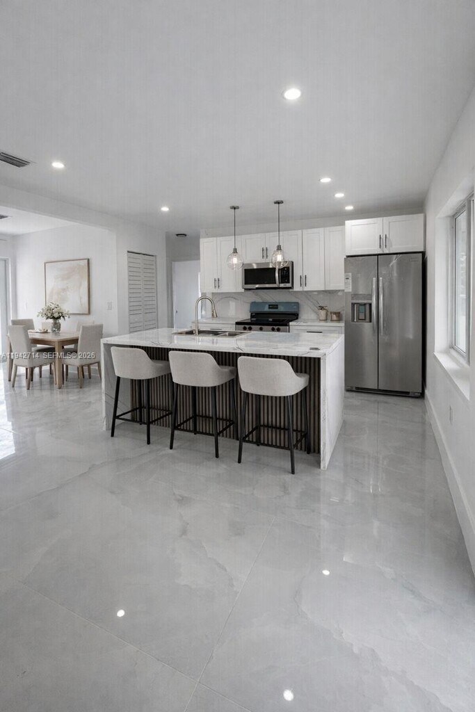 This beautiful, COMPLETELY remodeled home offers modern comfort and exceptional versatility. With new modern bathrooms, porcelin tile throughtout the home and a MODERN Kitchen gives this home a cozy feel. The main home boasts an open floor plan , recessed high-hat lighting, and freshly painted walls that create a bright, warm, and inviting atmosphere. The stunning dream kitchen is designed to impress, featuring modern white cabinetry, neutral countertops, a stylish backsplash, and a convenient snack bar—perfect for casual dining or entertaining. The bathrooms are elegantly updated with luxurious walk-in showers and sleek, contemporary finishes. Step outside to enjoy the expansive oversized yard, offering endless possibilities for outdoor living, gardening, entertaining, or creating your own private oasis. Situated in a non-HOA community, for easy approval. READY TO MOVE IN! This property combines modern upgrades with the freedom and flexibility to truly make it your own. This is a rare opportunity you don’t want to miss. Pet friendly. In addition to the main residence, the property includes a separate efficiency unit located on the side of the home, featuring a completely private entrance with no connection to the main house. MLS # A11942714