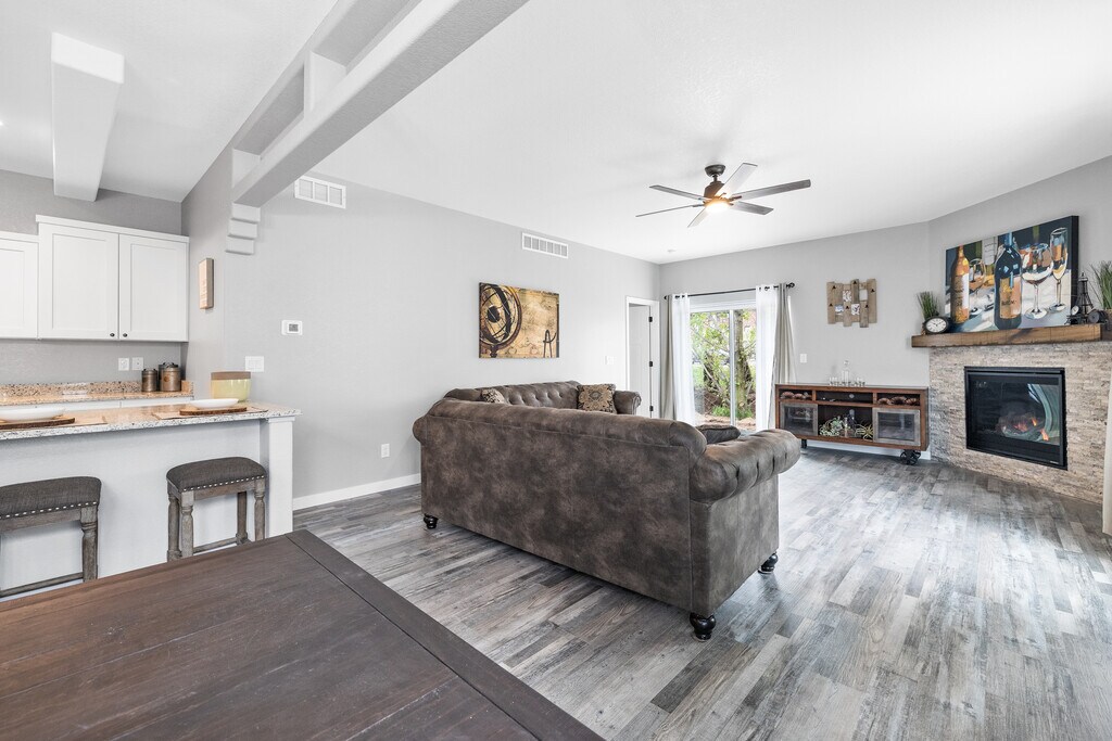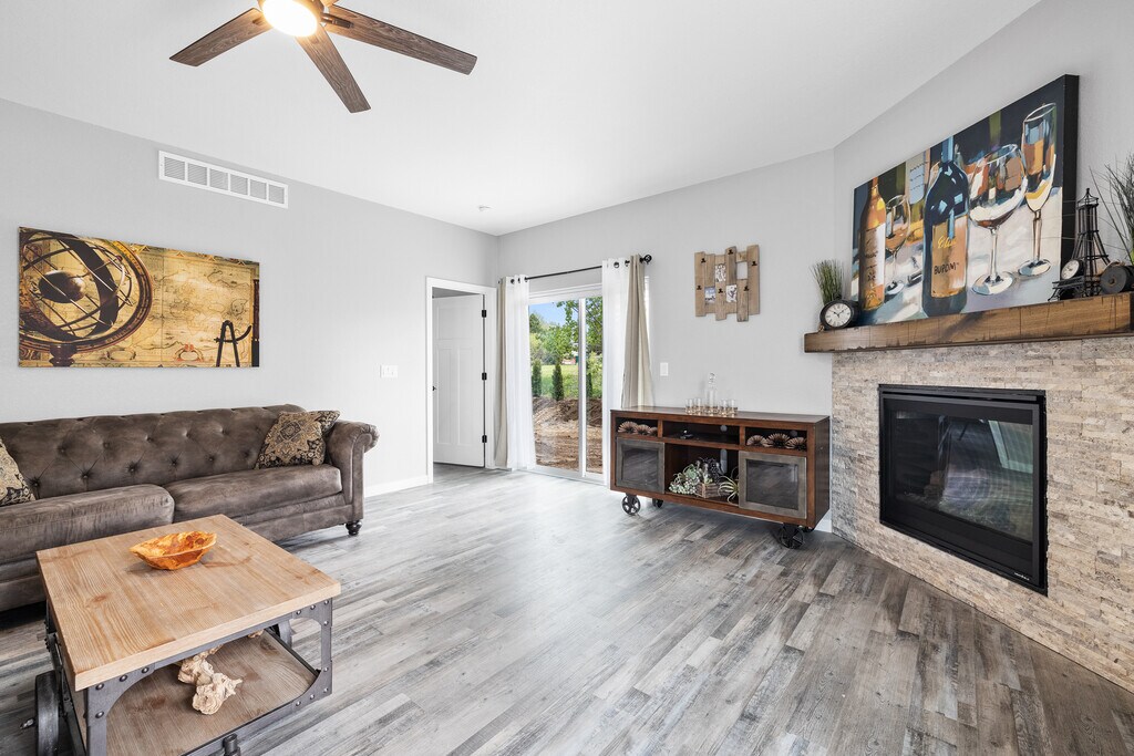 This open concept condo could be your new home. Efficient kitchen space with island for seating. Cozy up to your corner gas fireplace at night or enjoy your private patio. Private master BR w/generous walk-in closet. Master boasts a custom tiled, walk-in master shower. First months rent plus $2395 security deposit due upon acceptance. $1200 additional sec deposit for pets. 2 dogs max; less than 50#. 2 car garage and full basement. Also, NO SMOKING on premises inside home, garage or on property outside. Gently lived in, has the new look and feel to it. Don't wait - won't last long! Incl; Gas range, refrigerator, microwave & dishwasher. EXCL: Washer/dryer. Interior photos of similar floor plan of another unti.
