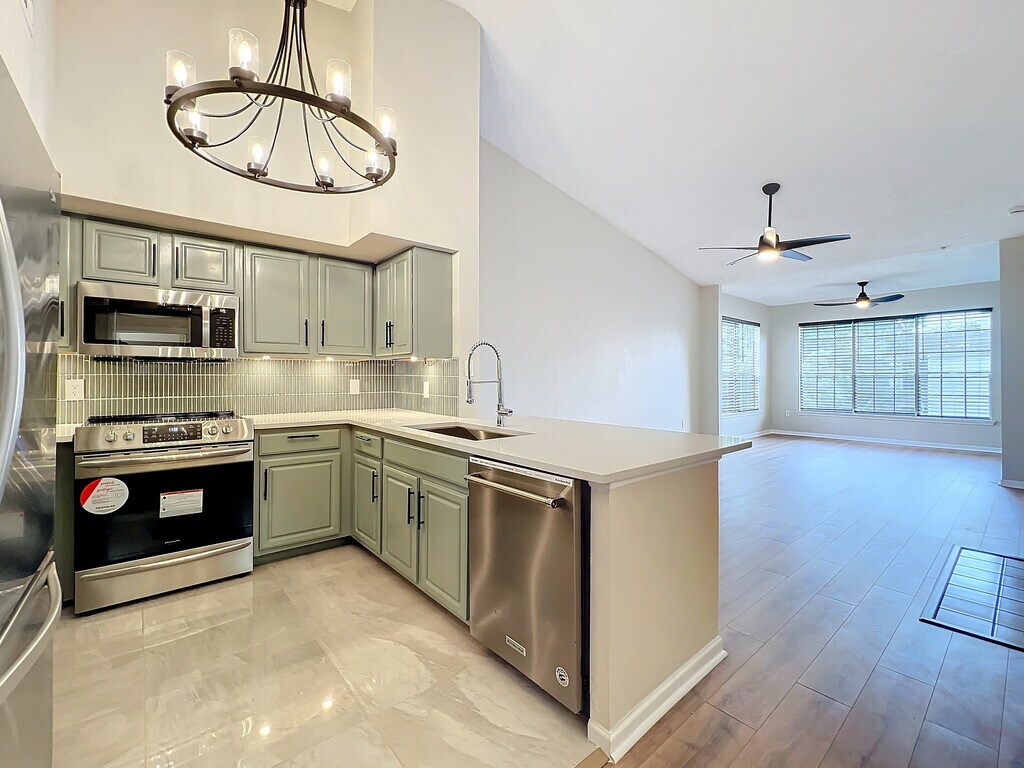 Welcome to your new home in Plantation Park, a serene oasis nestled in the heart of Lake Buena Vista, just off I-4. This exclusive gated community is perfectly positioned within Orlando's famed Golden Triangle, with the magic of Disney World, the thrills of Universal Studios, and the wonders of Sea World all just moments away. Residents are spoiled for choice with an abundance of dining, nightlife, and entertainment options at their fingertips. Step into luxury in this recently renovated 1-bedroom, 1-bathroom apartment, where modern elegance meets comfort. Soaring 12.5 ft vaulted ceilings create an airy and spacious atmosphere, while a functional fireplace adds a cozy touch. The open-concept kitchen is a chef's delight, featuring gleaming white quartz countertops with a cantilevered end for casual dining, and state-of-the-art stainless steel appliances. Whether you're hosting a dinner party or enjoying a quiet meal, this kitchen is designed to inspire. The en-suite bathroom is a sanctuary of sophistication, showcasing a porcelain tile shower equipped with a contemporary shower panel, providing a spa-like experience at home. The apartment is conveniently located on the 3rd floor, offering peace and privacy with no upstairs neighbors. Additional amenities include a sizable laundry closet complete with a washer and dryer, making everyday living effortless. Water and internet services are included in the rent, and your small pet (One pet up to 25 lbs) is welcome to join you at no additional fee. Living here means enjoying unparalleled access to Orlando International Airport and the newly launched Brightline Train terminal. Whether you're heading to West Palm Beach, Boca Raton, Fort Lauderdale, Aventura, or Miami, convenient travel is at your doorstep. **Not accepting applications from realtors or third party agencies** Minimum Credit Score of 670 Water and Internet included. Tenant pays electric. Free parking for up to two vehicles Pets up to 25 lbs welcome at no additional fee