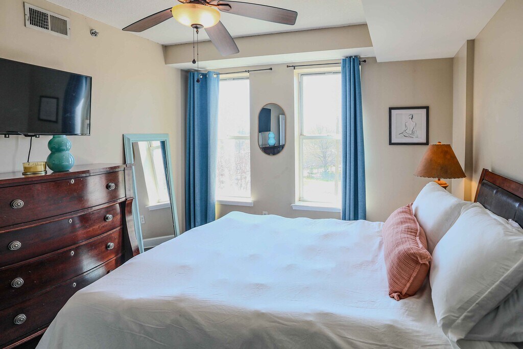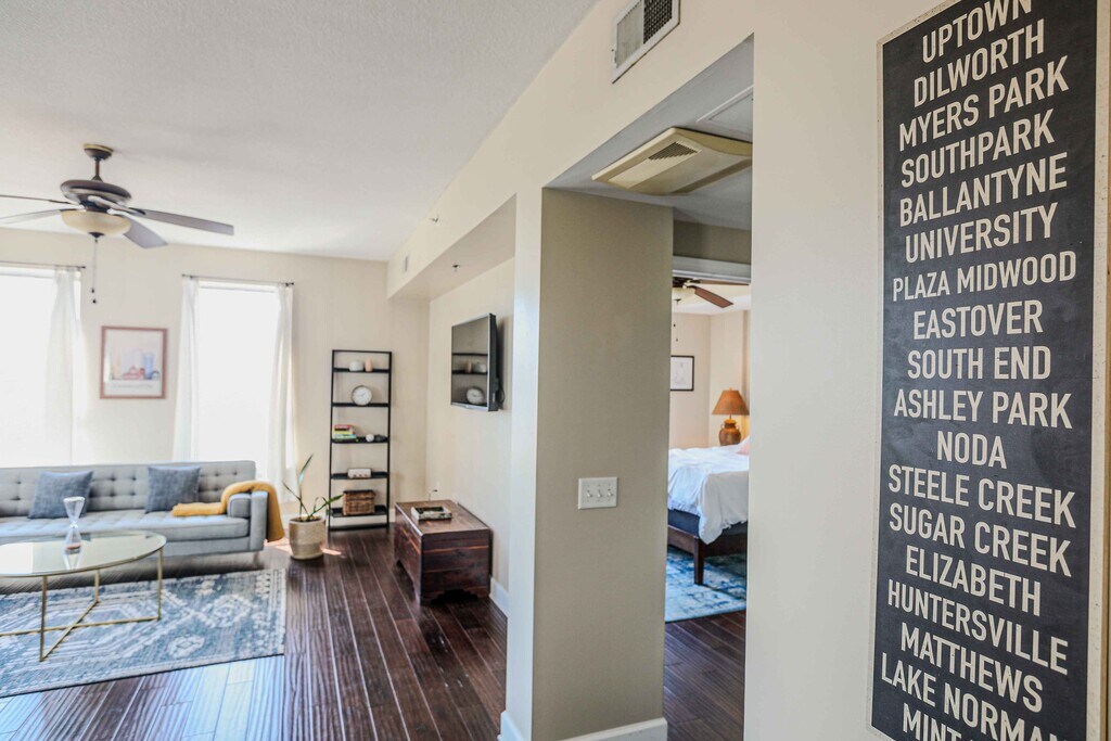 Juan Pablo Vidal GarciaBeautifully designed and furnished condominium in the heart of Dilworth. The building amenities include a full 24/7 access gym, a rooftop terrace, a beautiful courtyard with a large fountain that resonates throughout the building, and an Amazon Hub. Walkability is hard to beat here with 2 grocery stores in 2 neighboring blocks, immediate access to coffee shops, sushi bar, taco bar, and Italian food within the same building. Atrium Health Carolinas, the largest hospital in North Carolina, sits within a 4 minute walk. Inside the condo, you will find everything you need to cook, sleep, clean, entertain, and relax. Tons of natural light come in through the massive windows that face the courtyard fountain.
