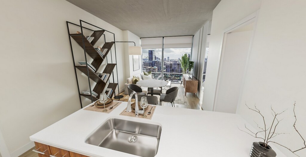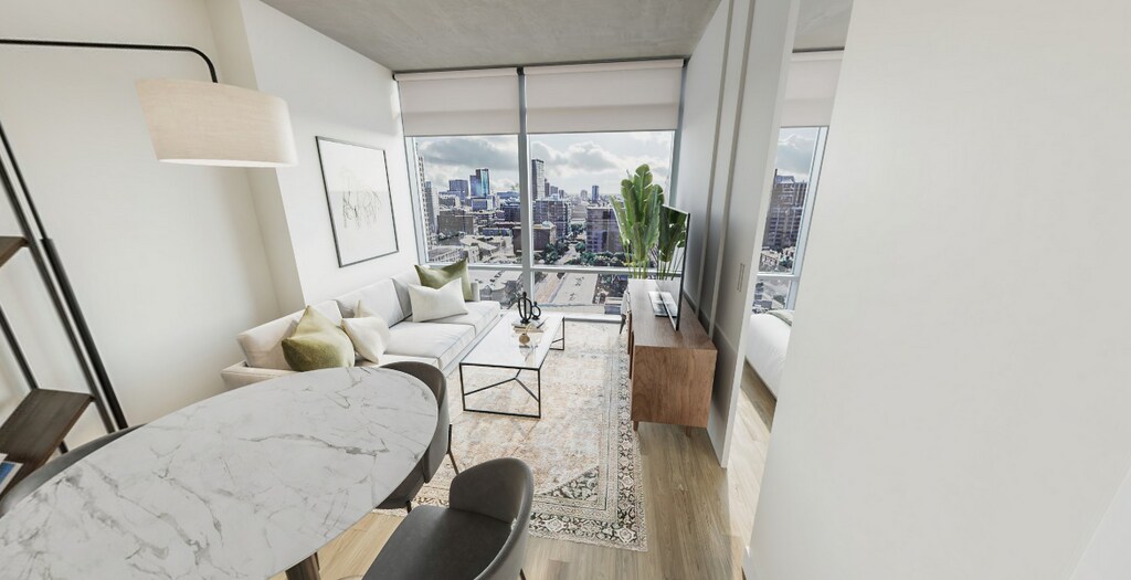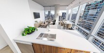 Set in a highly walkable pocket of the neighborhood, you’re surrounded by everyday essentials, dining, transit options, and quick access to the lakefront, Grant Park, and the Museum Campus. Inside the apartment, natural light takes center stage. Floor-to-ceiling windows pair seamlessly with exposed concrete ceilings for a true urban aesthetic. Kitchen leans modern and functional with sleek European cabinetry, quartz counters, and stainless appliances. Bathroom feel elevated yet practical, featuring clean-lined fixtures, oversized vanities, and minimalist mirrors. Everyday convenience is built in with smart thermostats and in-unit laundry. The amenity collection is designed for both downtime and hosting. Two outdoor terraces—one lower, one skyline-level—offer grilling stations, fire features, and space to unwind. Indoors, residents have access to a lounge and entertaining space with a full kitchen and private dining setup. The fitness center includes Peloton bikes, while added conveniences like package lockers, bike storage, and 24-hour door staff keep daily life running smoothly.