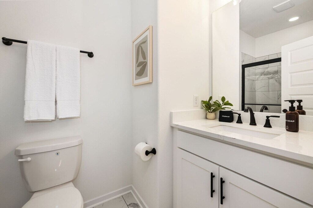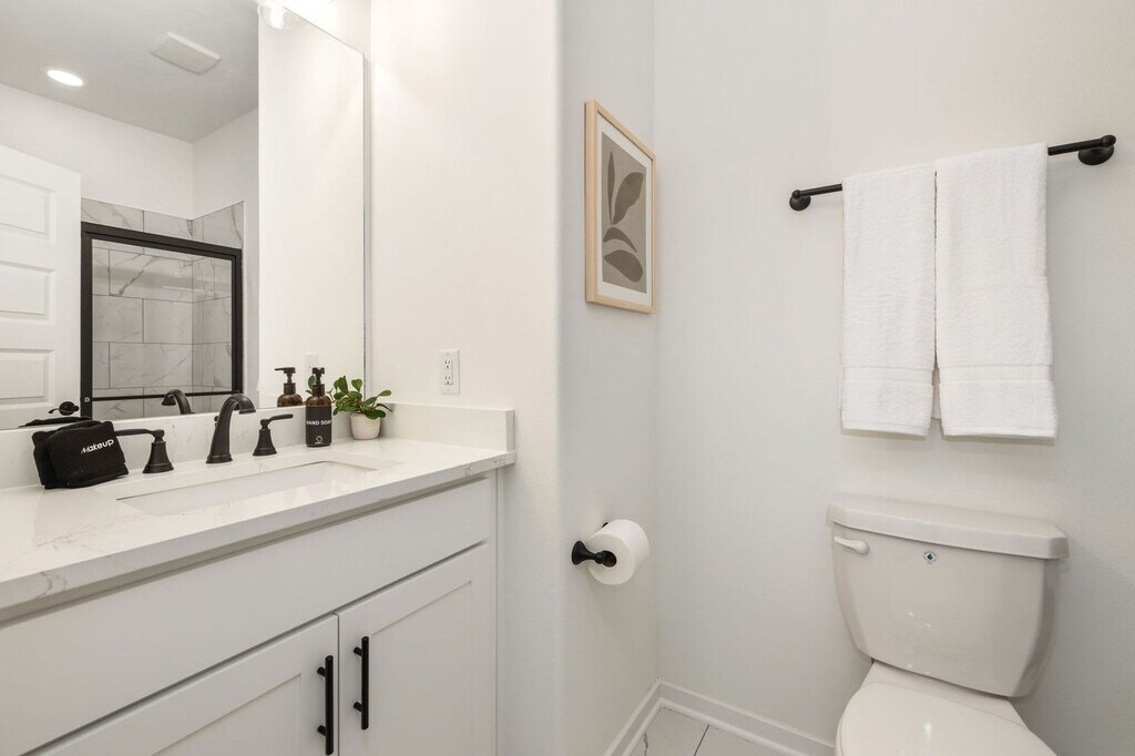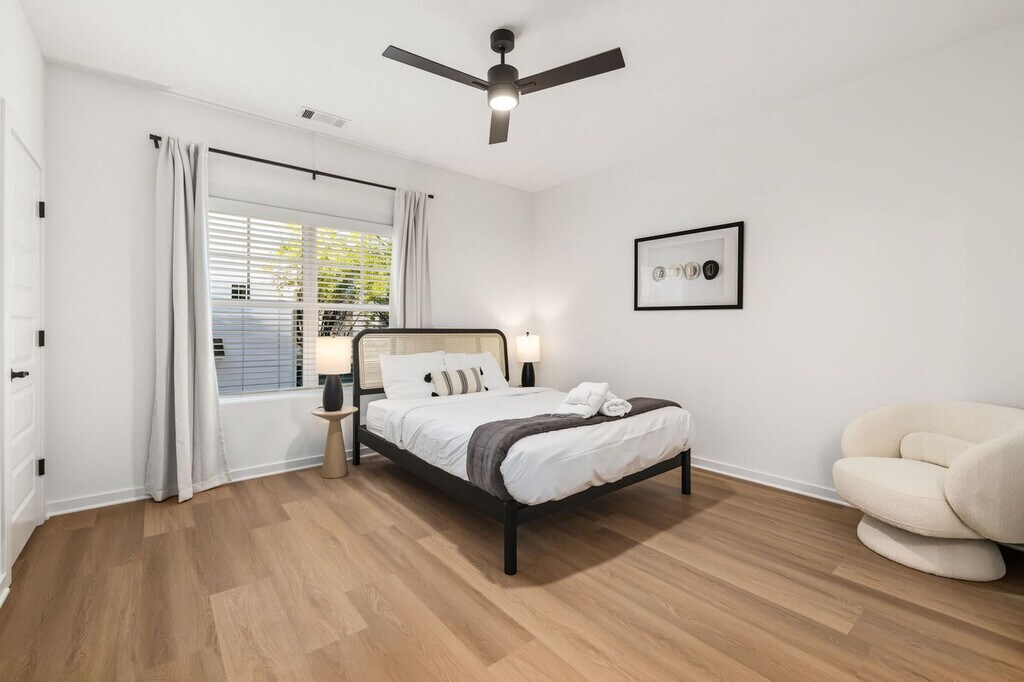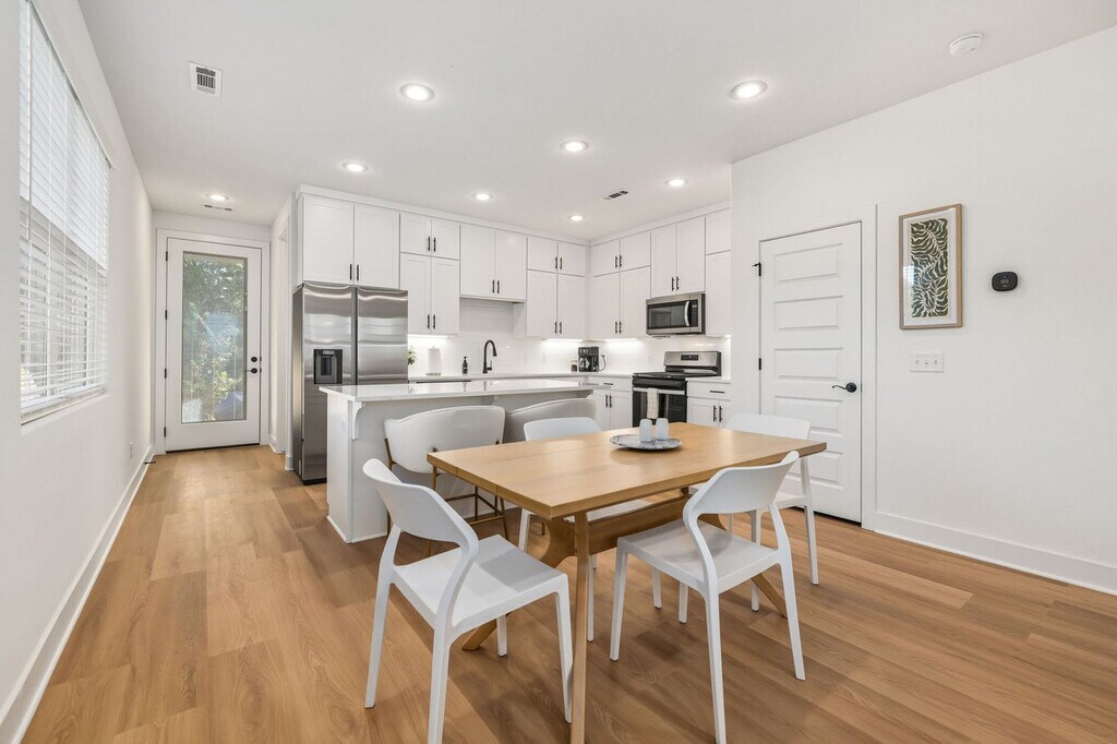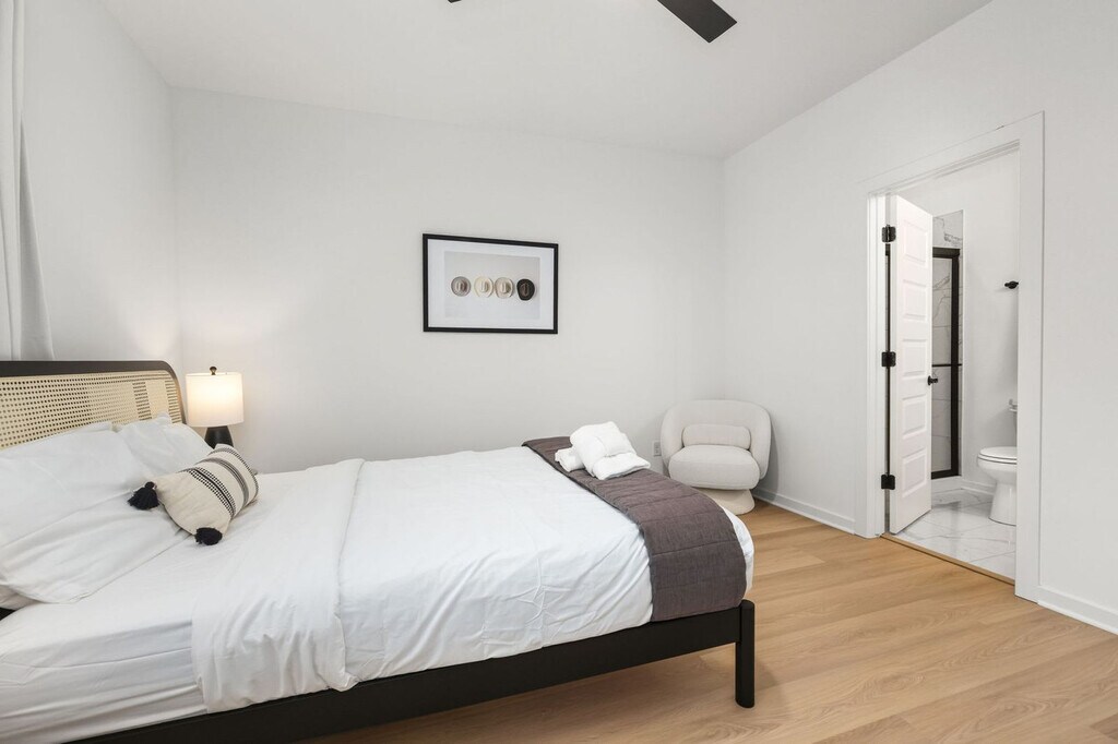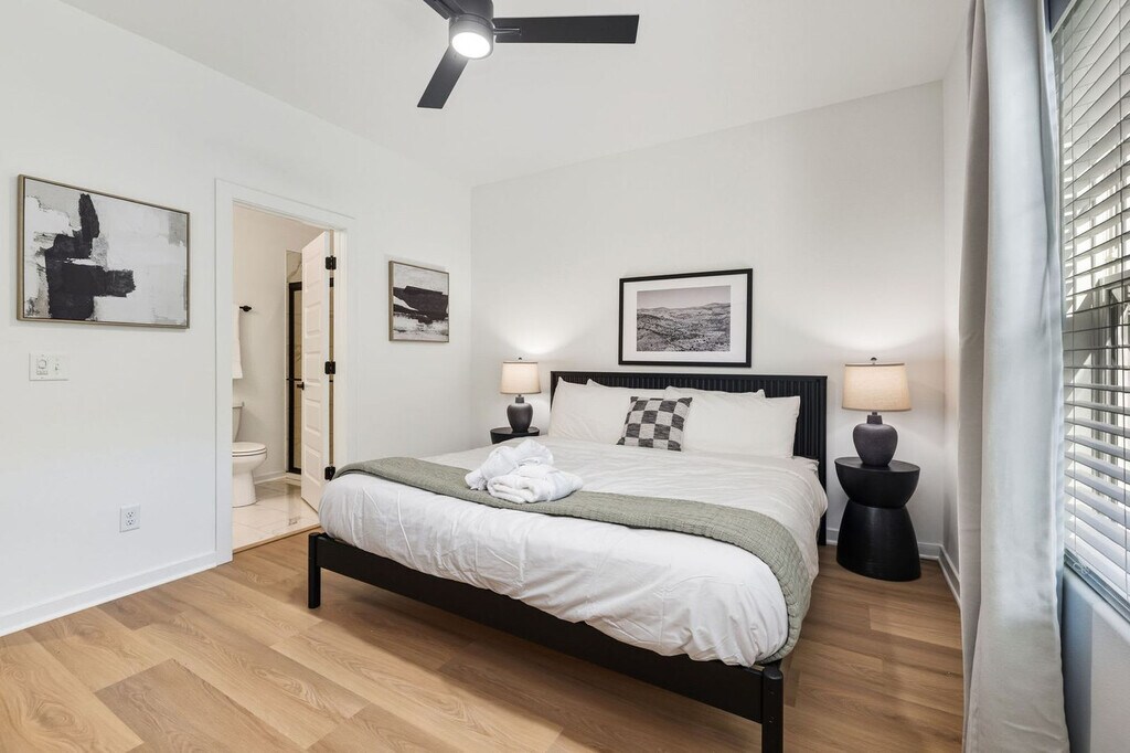 Feel at home in this newly built, modern home in Fayetteville. This 2-bedroom, 2.5-bath home offers luxury amenities for up to 4 guests. The bright, open floor plan features plenty of natural light and a cozy living/dining area. The fully stocked kitchen is equipped with new appliances and amenities. A washer and dryer are available for guest use. The backyard includes a grill and seating. The open-concept living room, kitchen, and dining space features plush seating, a large Smart TV, a dining table for 4, and a large kitchen island with bar seating. The kitchen has all the amenities needed to create a meal, baked goods, or just a great cup of coffee. The first bedroom is a king suite with a king-size bed, closet, dresser, and full attached bathroom. The second bedroom features a queen-size bed, closet, and nearby bathroom. This property is pet-friendly with a fee of $90 per dog, with a maximum of 3 dogs allowed. Located right by the college campus, this home is 0.5 mile from Baum Walker Stadium, 1 mile to the University of Arkansas campus, and 1.5 miles from downtown Fayetteville. Enjoy easy access to the Razorback Greenway, with the Fayetteville Transverse trail just 1 block away and the Frisco trail 1/2 mile away. Walker Park, with basketball courts, a splashpad, and playgrounds, is a 1/2 mile walk away. Public transit, bike trail access, and ride-sharing services are available. Parties or guest actions that result in disturbances, property damage, extensive extra cleaning, or smoking indoors will incur a fine of $1,000. Dogs discovered at the property without prior notice or cats discovered at the property will incur a fine of $400. Unauthorized checkout delays will incur a fine of $100 per hour. Quiet hours are observed between 10:00 PM and 10:00 AM. Check-in is any time after 3:00 PM. [SI]