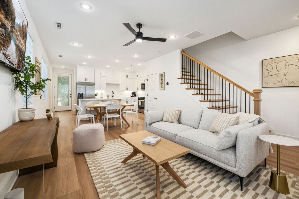 Feel at home in this newly built, modern home in Fayetteville. This 2-bedroom, 2.5-bath home offers luxury amenities for up to 4 guests. The bright, open floor plan features an open-concept living/dining area with plush seating, a large Smart TV, and a dining table for 4. The fully stocked kitchen includes new appliances and amenities. A washer and dryer are available for guest use. Enjoy the backyard with a grill and seating. This property is pet-friendly with a fee of $90 per dog, with a maximum of 3 dogs. Located near the college campus, this home is just 0.5 miles from Baum Walker Stadium, 1 mile from the University of Arkansas campus, and 1.5 miles from downtown Fayetteville. Enjoy easy access to the Razorback Greenway, with the Fayetteville Transverse trail just one block away and the Frisco trail 0.5 miles away. Walker Park, with basketball courts, a splashpad, and playgrounds, is also just a 0.5-mile walk away. The neighborhood is home to amazing local restaurants and shops, and popular bike trails. Public transit, bike trail access, and ride-sharing services are available. Parties or guest actions that result in disturbances, property damage, extensive extra cleaning, or smoking indoors will incur a fine of $1,000. Dogs discovered at the property without prior notice or cats discovered at the property will incur a fine of $400. Unauthorized checkout delays will incur a fine of $100 per hour. Quiet hours are between 10:00 PM and 10:00 AM. [SI]