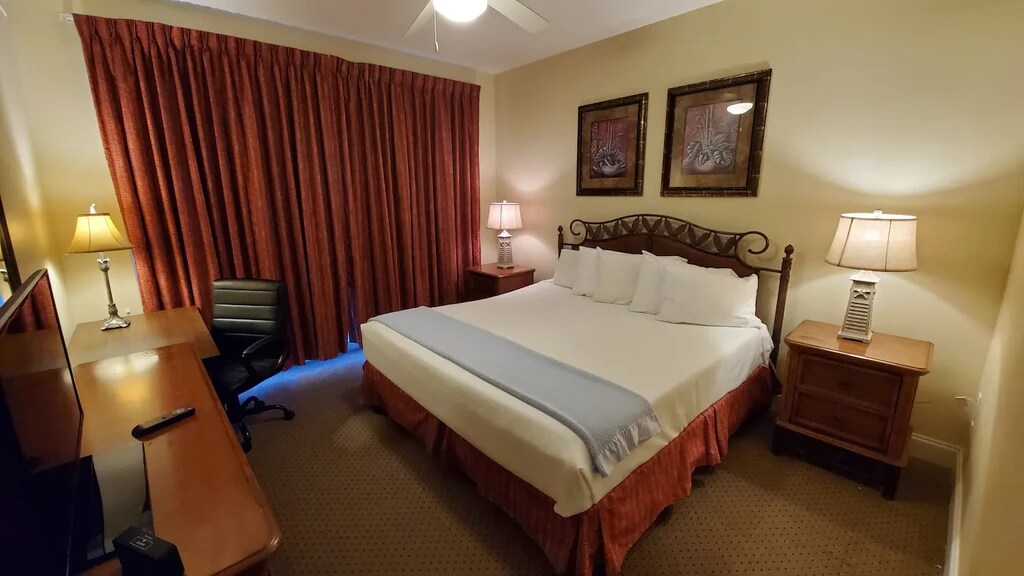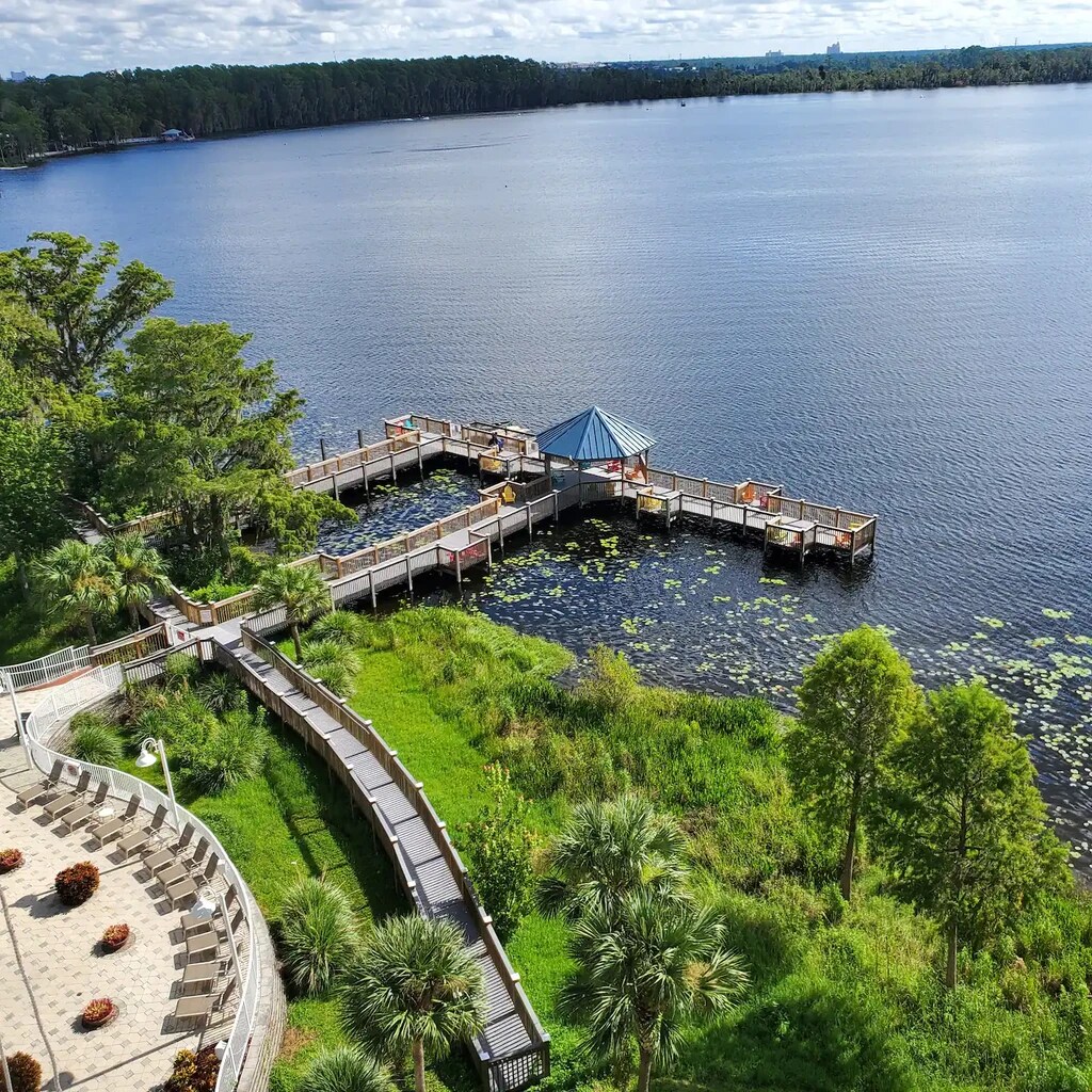 BEAUTIFUL CONDO ON GORGEOUS LAKE JUST MINUTES FROM DISNEY! MINIMUM STAY ONLY 5 DAYS! Beautifully decorated 2-bedroom + alcove (3rd bedroom), 4-bed condo just 10 minutes from Disney on a 214-acre lake. The private 25-foot balcony has a stunning view of the lake and sunrise, and a view of the Disney fireworks just outside your door. Amenities include 2 full baths, fully equipped kitchen, washer/dryer, high speed internet, gated entrance, free covered parking next to the elevators, and much much more! NOTE: We can host up to 4 adults and 2 children (there are 2 king beds and 2 child-sized beds). THE SPACE: Our facility also boasts 2 pools, a hot tub, and 2 workout rooms. The pool is heated to 82 degrees and it uses a salt filtration system instead of chlorine which is easier on the eyes. It is only one block (very short walk) to Starbucks, Subway, McDonald's, Chick-fil-A, and a Dollar store, and two blocks to Walgreens and restaurants. This condo is on the 6th floor near the elevators for easy access, so you won't have to climb stairs or pull your luggage up and down. The private balcony overlooks lake Bryan, a beautiful lake with wildlife and a boardwalk running through the trees and along the shore. Take a relaxing walk or curl up in the gazebo with a book or your laptop--you can plug into the outlet there and surf the internet via the wifi. If you plan to visit Disney it's preferable to have a car, but if not you can take an Uber or Lyft for only about $20; it's just a few minutes drive and they drop you off past the parking lots, saving you time, plus you don't have to pay the $30 Disney parking fee! This beautiful condo has recently been remodeled with new furniture and appliances. We know your stay here will be relaxing and full of wonderful memories! OTHER THINGS TO NOTE: Our condo is perfect for grandparents and their grandchildren, or up to 4 adults and 2 children. Please note that the third bedroom is an alcove with a bunkbed (2 beds on top of each other) which is only designed for children. See our photos which include a floor plan. We provide 2 days worth of soaps and detergents. If you need more, there is a dollar store with all kinds of supplies just one block's walk away next to the miniature golf course. TO VIEW THE CURRENT SCHEDULE AND BOOK THIS CONDO: All bookings and inquiries are handled exclusively through Airbnb. For pricing and current schedule, please visit our Airbnb site at: (If link does not show, go to Airbnb and search for listing #45286241)