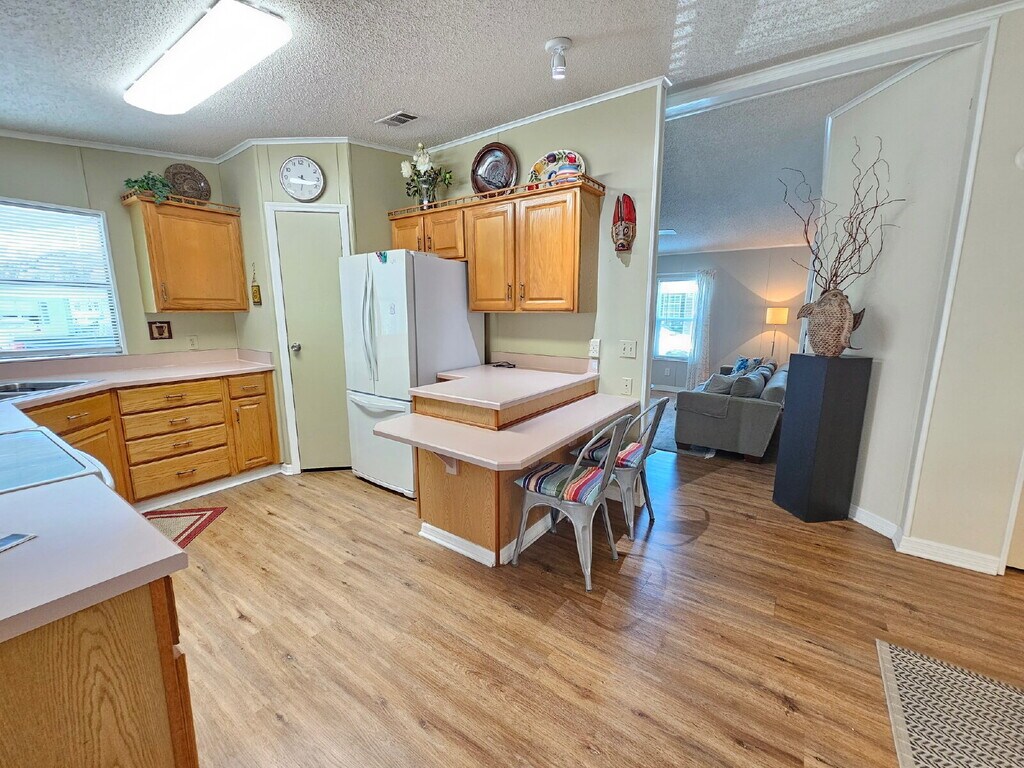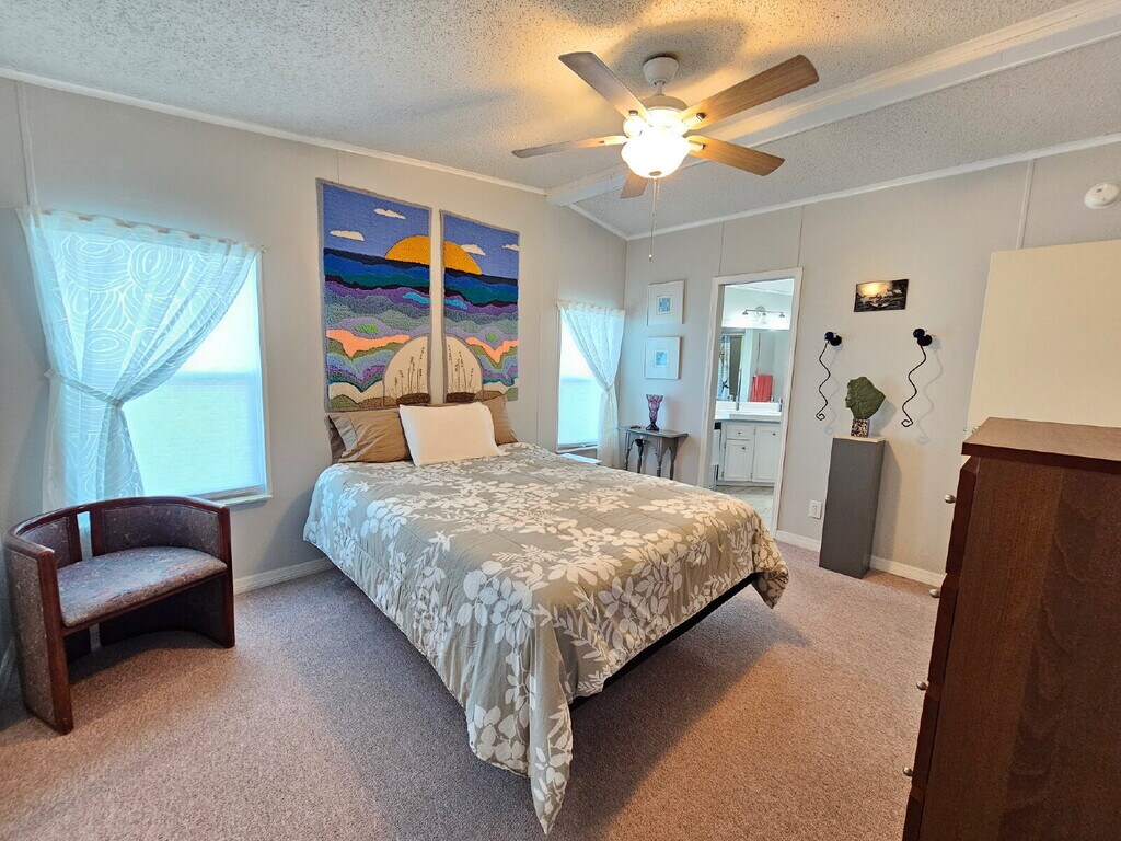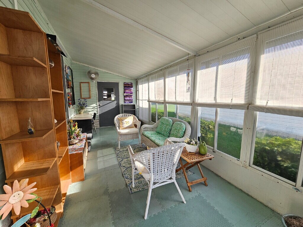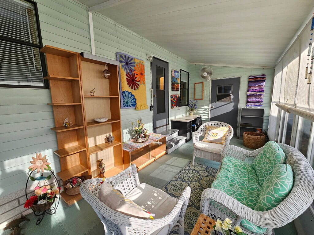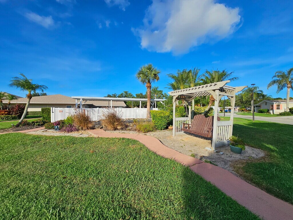 Fully furnished and move-in ready, this home is available in the desirable 55+ gated community of Island Lakes, just over the barge. Known for its quiet atmosphere and welcoming neighbors, the community offers a pool, clubhouse, and regular events. The home features tasteful, unique décor, LVP flooring throughout with carpeted bedrooms, a screened side patio, and a two-car carport. A washer and dryer are conveniently located in the storage room. Enjoy being just 10 minutes from the beach, the Space Center, shopping, dining, and more plus, watch rocket launches from your own yard. One mature pet considered with additional fees.