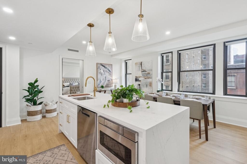 Brand new two bedroom, two bathroom with sunset city views and modern finishes at The Wellington on Rittenhouse Square! This new construction home features an expansive great room with oversized windows and an open layout, perfect everyday living and entertaining; a sleek open kitchen with white shaker cabinetry, quartz countertops and backsplash, GE stainless steel appliances, and a center island with breakfast bar and waterfall countertop; a spacious primary suite with a wall of oversized windows, large walk-in closet, and an ensuite bathroom with a modern white vanity, glass-enclosed shower, and calacatta tilework; a generously sized second bedroom with large wall closet; full hall bathroom appointed in calacatta tilework with sleek vanity and glass-enclosed shower; stacked LG washer/dryer; and recessed lighting, excellent closet space, and vinyl floors throughout. This home also enjoys individual heat & air conditioning controls. The Wellington is a pre-war apartment building located on Rittenhouse Square offering a 24 hour doorman, on-site management, and access to a nearby fitness center at 1845 Walnut. Tenants are responsible for paying all utilities.