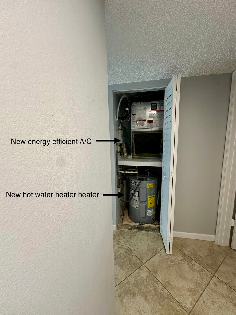 This is a large 1st floor 1 bedroom end unit with an additional 10X12 den/storage area. High speed internet and TV is included. Property has a heated pool, salt water pool, hot tub, gym, tennis court, 2 pickleball courts, 1/2 court basketball, clubhouse with library, ping pong room, kitchen and TV seating area. Plenty of unassigned parking on property and walking distance to many stores like Publix and Whole Foods. Centrally located to 41 and 75. Unit has a new Rheem energy efficient A/C unit and New Hurricane impact windows making the unit extremely quiet, safe and energy efficient.