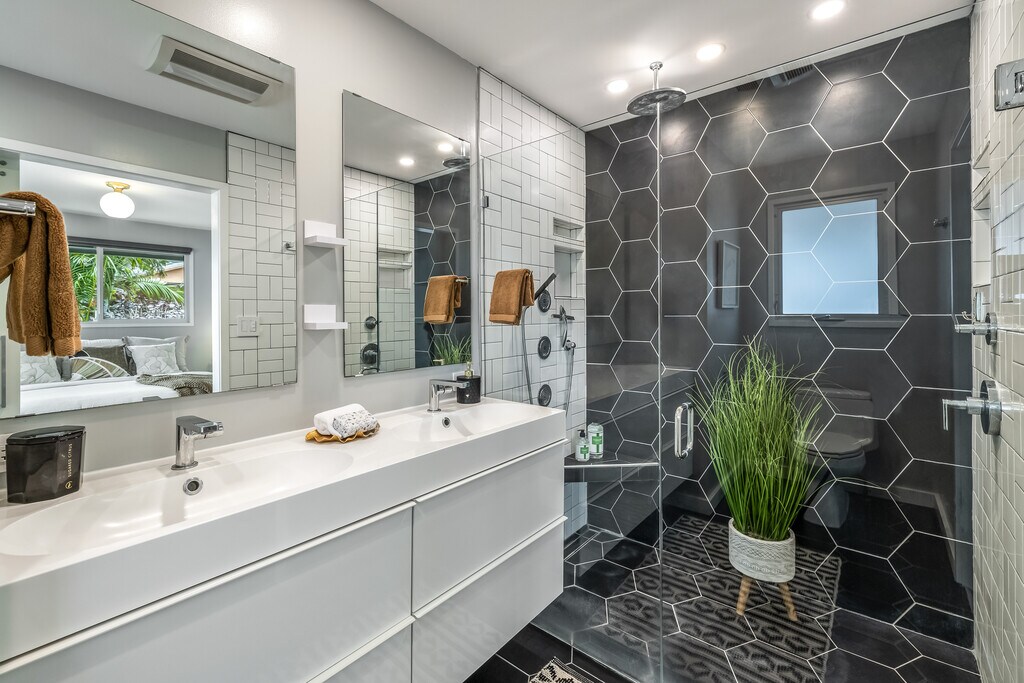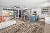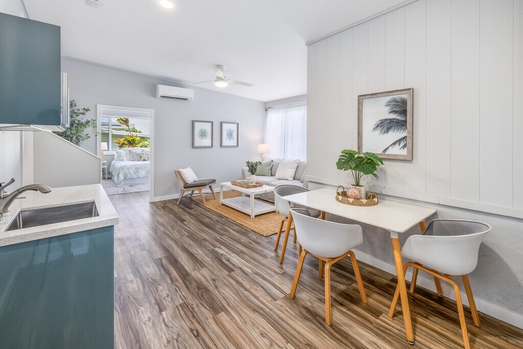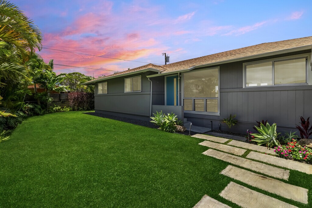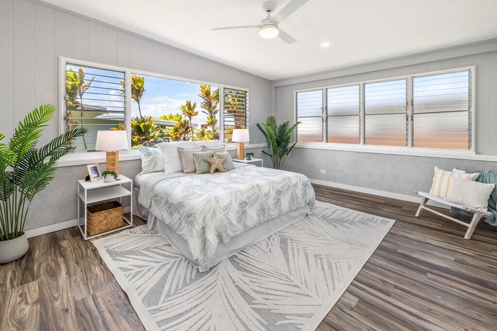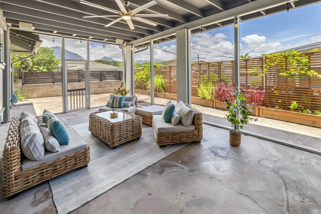 Beautifully remodeled 3-bedroom, 2-bath home with a large screened-in back patio and attached 1-bedroom, 1-bath in-law suite. This modern island-style kitchen features high-gloss cabinets, contemporary appliances, double ovens, and a gas cooktop on a large island. Clean lines and open flow to the dining, living room, and large screened-in back patio, perfect for entertaining. The primary bedroom has pendent lights, a built-in closet organizer, and an ensuite with a luxury shower system. Split AC in every bedroom. Bathrooms are remodeled with stylish tile work, high-gloss cabinets, and a double vanity. The in-law suite has a spacious bedroom with lots of windows to enjoy the island breeze and natural light. Sliding door to access the back patio, which houses the full-size washer and dryer. It has a separate living area with a wet bar, full bathroom, storage closet, and private entrance. Fresh landscaping and planter boxes. 2-car carport includes a large storage closet. Offered for rent by Island Hale Property Management, LLC. License No. RB-22992