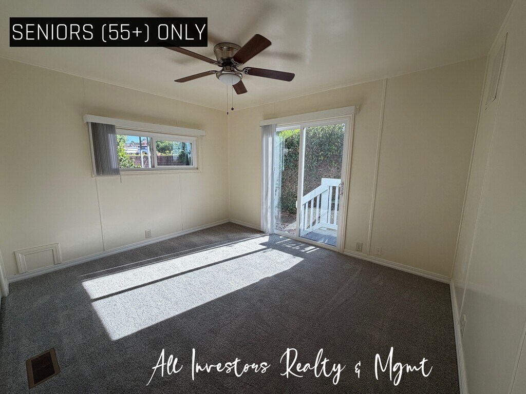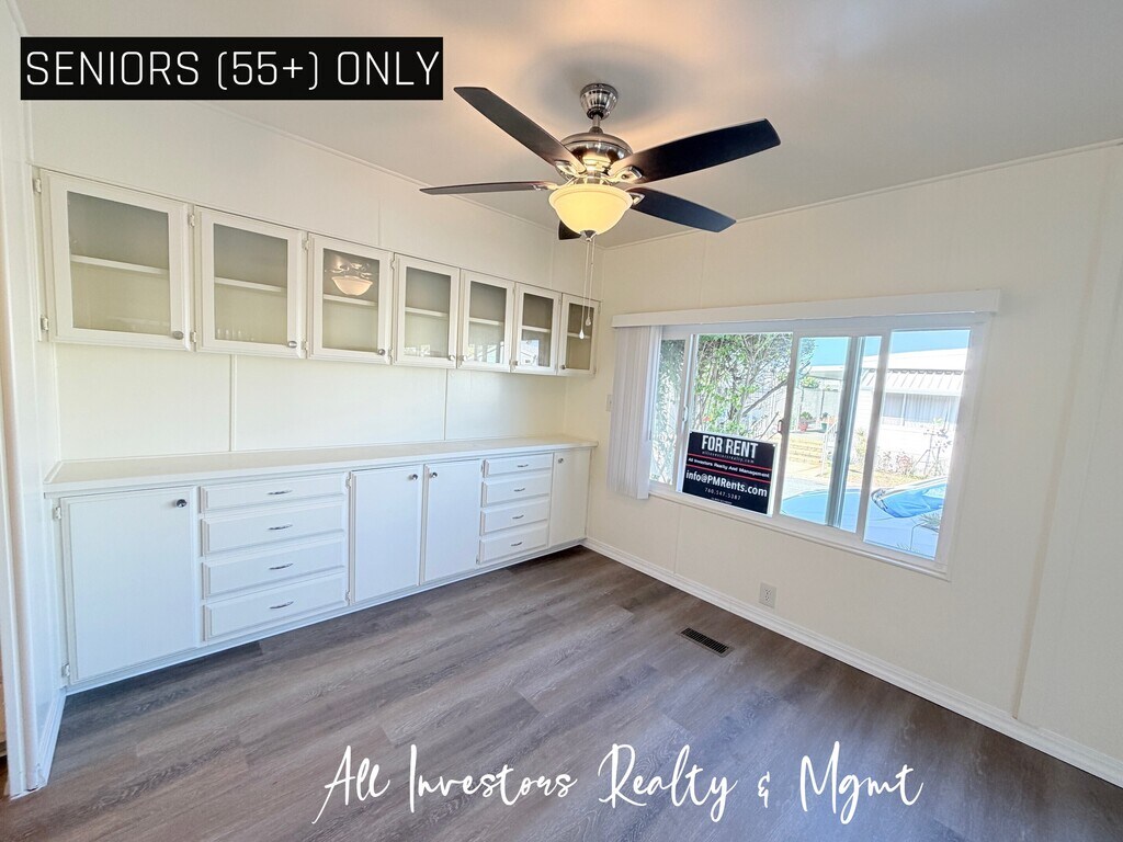 SENIORS ONLY (55+). THIS IS A SENIOR PARK. SIMPLY CLICK ON THE "REQUEST A SHOWING LINK" TO SCHEDULE AN APPOINTMENT OR FOR ADDITIONAL INFORMATION. This two bedroom home is located in the desirable Mission View West Mobile Home Park. Conveniently located within blocks of grocery stores, library, retail stores and public transportation. Within a ten minute drive to some of the finest beaches in North County and the Oceanside harbor and pier. This two bedroom, two bath home includes beautiful luxury vinyl plank flooring in the open and flowing living areas. The large kitchen features quartz counters and an abundance of cabinet and counter space. Enjoy a large built in hutch in the dining room. Wonderful outdoor patio area, yard and storage shed. The community amenities include pool, spa, recreation room, card room, laundry facilities and a car wash bay. One small pet may be permitted. Tenant pays all utilities including water and trash. Equal Housing Opportunity. Contact All Investors Realty And Management at for additional information. CABRE#02148089. SENIORS ONLY (55+). THIS IS A SENIOR PARK. SIMPLY CLICK ON THE "REQUEST A SHOWING LINK" TO SCHEDULE AN APPOINTMENT OR FOR ADDITIONAL INFORMATION. This two bedroom home is located in the desirable Mission View West Mobile Home Park. Conveniently located within blocks of grocery stores, library, retail stores and public transportation. Within a ten minute drive to some of the finest beaches in North County and the Oceanside harbor and pier. This two bedroom, two bath home includes beautiful luxury vinyl plank flooring in the open and flowing living areas. The large kitchen features quartz counters and an abundance of cabinet and counter space. Enjoy a large built in hutch in the dining room. Wonderful outdoor patio area, yard and storage shed. The community amenities include pool, spa, recreation room, card room, laundry facilities and a car wash bay. One small pet may be permitted. Tenant pays all utilities including water and trash. Equal Housing Opportunity. Contact All Investors Realty And Management at for additional information. CABRE#02148089.