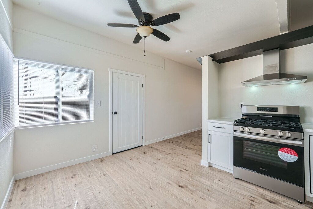 Welcome to this newly remodeled 2-bedroom, 1-bath unit in Downtown Las Vegas. This modern home features new wood and carpet flooring, a fully updated kitchen with stainless steel appliances, a new 5-burner stove, stainless steel range hood, and granite backsplash. Enjoy the convenience of an in-unit washer and dryer, ceiling fans throughout, and mirrored closet doors in the primary bedroom. The duplex-style layout includes a fully fenced concrete backyard patio, perfect for private outdoor use. A well-updated unit offering comfort and functionality in a central location.Trash, Sewer and Tenant Portal Fee are included in rent!