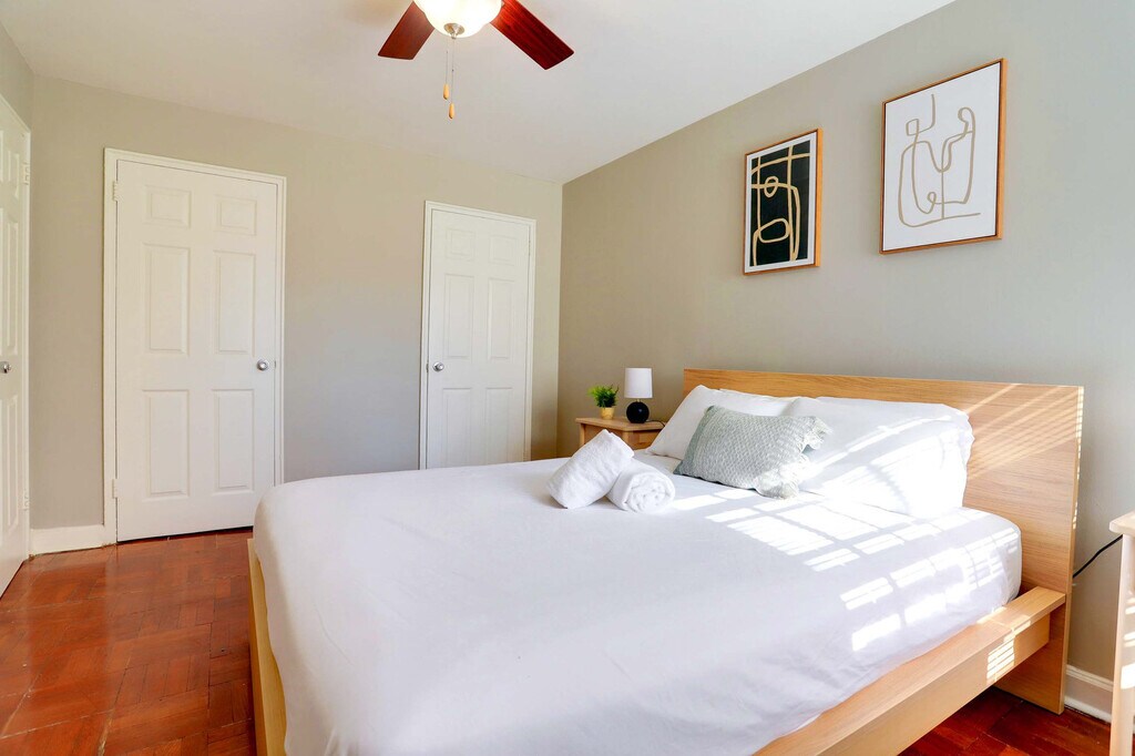 Experience the best of Alexandria from this stylish 2-bedroom apartment in the heart of the historic Old Town North district. Steps from the scenic Old Town Alexandria Waterfront and Mount Vernon Trail, you'll feel at home in this perfect home-away-from-home. Thoughtfully designed interiors, modern appliances, and cozy furnishings ensure a welcoming retreat. The apartment features a spacious lounge with a TV, a master bedroom with a plush king-size bed and soft linens, and a second bedroom with a comfortable queen-size bed. The fully equipped kitchen has modern appliances and all the essentials you need to cook your favorite meals. There is also a stylish full bathroom with a clean, contemporary design, starter toiletries, and fresh towels. Secure bike storage is available. Located in Old Town North, this apartment is in a picturesque neighborhood offering a unique blend of history, culture, and modern convenience on the banks of the Potomac River. It's a walker's paradise, with the Old Town Waterfront and numerous parks, cafes, and restaurants just a short stroll away. You are also right next to the iconic 18-mile Mount Vernon Trail, perfect for a scenic bike ride along the Potomac River. The Braddock Road Metro Station is just a few minutes away, offering quick and easy connections to the heart of D.C. For your convenience, a large and well-stocked Safeway with a pharmacy and Starbucks is located nearby. Loud music and parties are strictly prohibited and may result in fines from building management. Please park only in designated white spaces to avoid being towed; yellow spaces are reserved, and we are not responsible for towed vehicles. The building requires a brief guest screening prior to check-in, which must be completed before arrival. Smoking inside is charged a $300 fine, and a party on the property is charged a $300 fine. [SI]