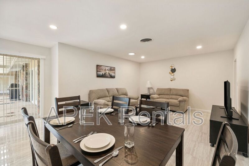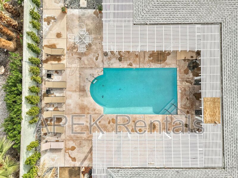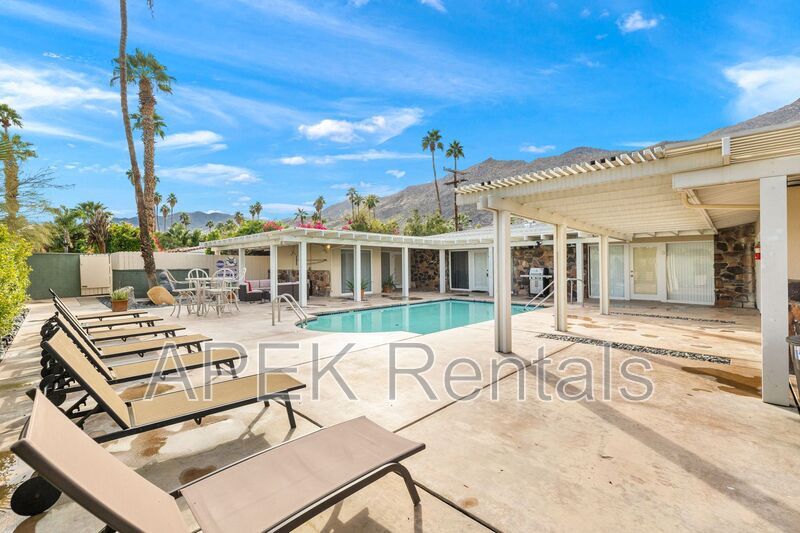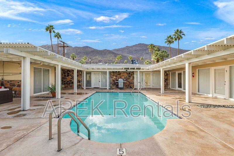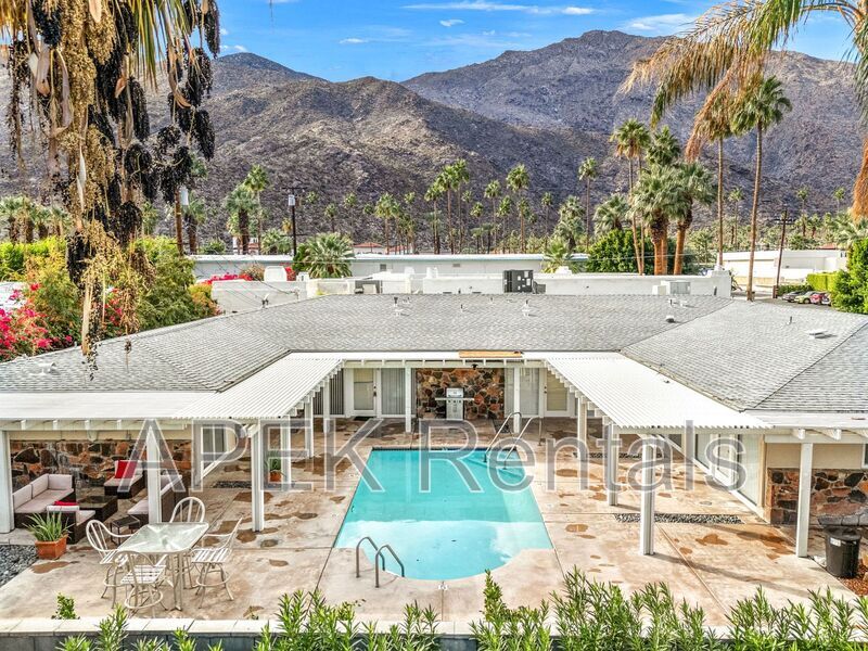 Welcome to this beautifully updated 2-bed, 2-bath mid-century modern home offering 1,050 sq ft of refined desert living. Completely renovated throughout, the residence features a granite-top kitchen with stainless steel appliances, all-new marble and stone flooring, and thoughtfully selected furnishings that create a clean, modern aesthetic. Located on a quiet residential street in highly sought-after South Palm Springs, this long-term rental provides the perfect balance of comfort and convenience. The home overlooks a peaceful central pool with soothing water features, creating a serene environment ideal for relaxation after a long day. With its prized location just minutes from downtown Palm Springs, residents can enjoy easy access to dining, shopping, entertainment, and local attractions—all while living in a calm, well-maintained community setting. We have 5 available units. We have fully-furnished, and non-furnished units available, and these are a rare long-term rental opportunity for those seeking modern style, tranquility, and unbeatable Palm Springs lifestyle. Amenities: bbq, hot water, free parking on premises, outdoor seating (furniture), patio or balcony, outdoor pool, a/c, central heat