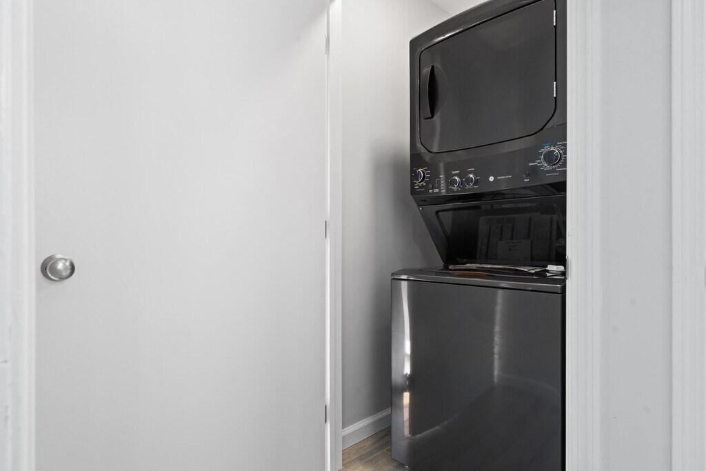 Welcome home! Completely renovated 2 bed, 1 bath apartment with a modern, open feel. Features include soft-touch cabinetry with quiet-close doors and drawers, quartz countertops, stainless steel appliances, and wood floors. In-unit washer/dryer, central air, abundant closet space, and assigned parking add convenience and comfort. Fresh paint throughout creates a pristine, move-in-ready home. The apt is conveniently located near public transportation, schools, parks, restaurants and shopping area. Must see in person, you'll be immediately impressed by the stylish and functional design.
