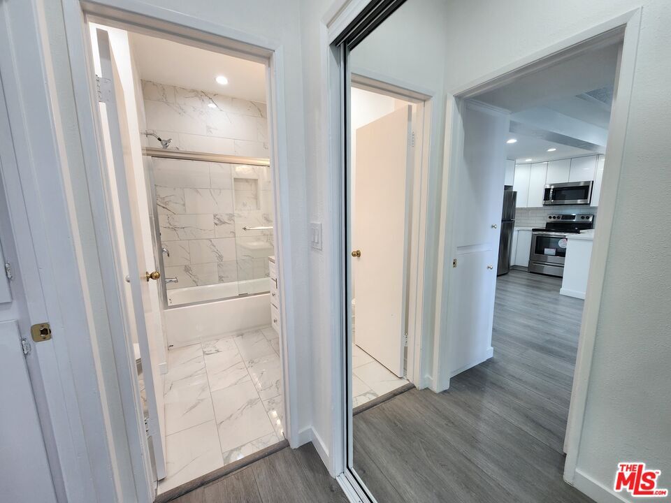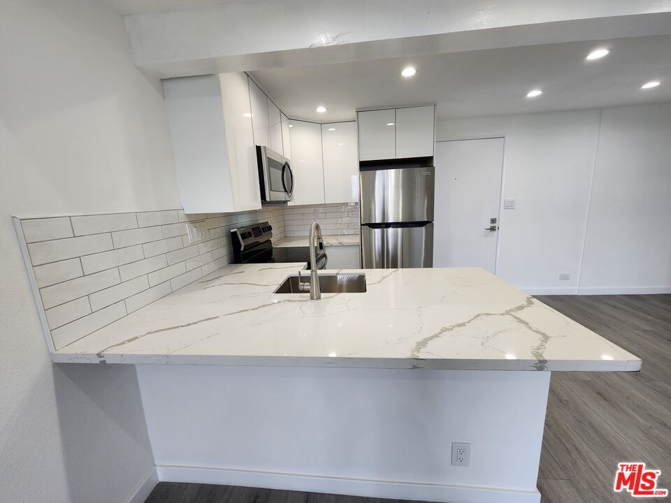 Welcome to a serene and stylish escape at 1440 Veteran Avenue, a boutique resort style condominium community nestled in the heart of Westwood. This beautifully updated second floor one bedroom residence offers a seamless blend of comfort, practicality, and elevated living. Step into an open concept layout with soaring nine foot ceilings and soft recessed lighting that set a calming tone throughout. The remodeled kitchen is both elegant and functional, featuring quartz countertops, sleek modern appliances, abundant white shaker cabinetry, a large apron sink, and a classic subway tile backsplash. The living and dining areas flow naturally onto a peaceful north facing balcony overlooking a quiet, tree lined walkway between buildings. Hardwood style vinyl plank flooring adds warmth and continuity throughout the home. The spacious bedroom offers a tranquil retreat, comfortably accommodating oversized beds such as a king or California king, and includes two generous closets. A thoughtfully renovated bathroom invites you to unwind with a deep soaking tub and shower combo, custom marble top vanity, and clean white subway tile walls. One assigned parking space in the gated garage and access to convenient bike storage rooms provide added ease. On-site electric vehicle charging stations are also available for your convenience. Beyond your front door, the building offers 24 hour security, digital package tracking, an on site manager, a fully renovated fitness center with Precor and Peloton equipment, a steam room, sauna, lounge, conference room, party space with catering kitchen, and lush grounds with koi ponds, waterfalls, a heated pool, and spa. Across the street, a sprawling park invites you to enjoy tennis and basketball courts, soccer fields, and a dog park. Located just minutes from UCLA, Westwood Village, and the upcoming Purple Line station, this exceptional home includes all utilities; electricity, water, and trash and offers an unmatched lifestyle of ease and convenience. Applicants must meet minimum income and credit score requirements and will undergo a credit, background, criminal, and eviction screening through our third party service, RentSpree. MLS# 25598435
