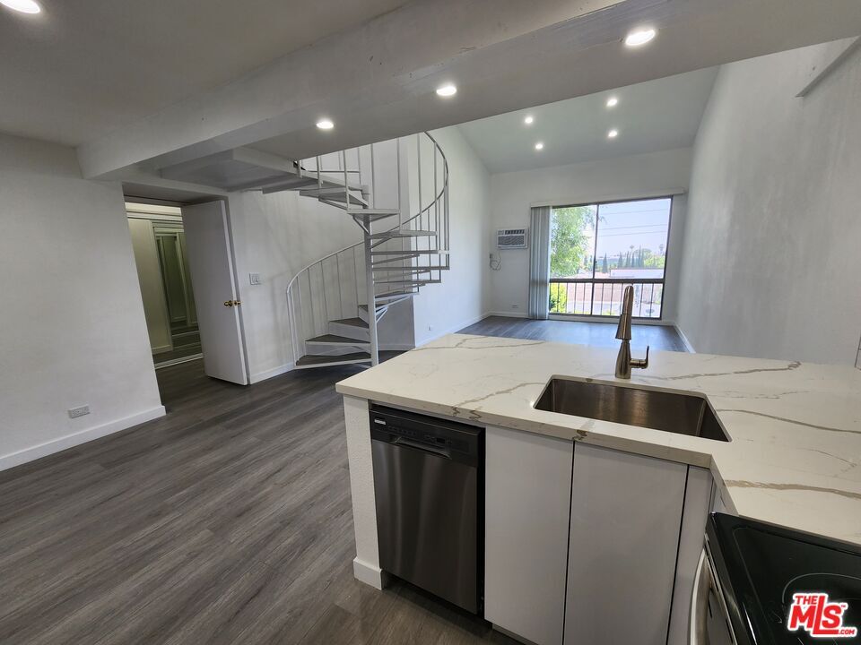 Elevate your lifestyle in this fully renovated, modern loft-style condo, perfectly designed for young professionals seeking a chic, boutique hotel-like living experience. Centrally located in the heart of Westwood, this resort-style building offers luxury and convenience, with amenities including a 24-hour security guard, package delivery service, an on-site manager, and a state-of-the-art fitness center featuring a gym, steam room, and sauna. Enjoy the outdoor oasis, complete with lush landscaping, waterfalls, lounging areas, a pool and spa, koi ponds, and even friendly turtles. This top-floor unit boasts expansive tree-top views overlooking the quiet single-family home neighborhood to the south. The sleek kitchen, outfitted with brand-new cabinetry, stone countertops, and stainless steel appliances, seamlessly flows into the open living space, making it ideal for entertaining or unwinding after a long day. A striking spiral staircase leads to the loft area, perfect as a second bedroom or home office/den. The first-floor primary bedroom offers privacy and comfort, with an en-suite bathroom that provides a nice separation of space from the loft area. The condo features new hardwood-style vinyl plank flooring throughout, adding to its modern appeal. With one assigned parking spot in the secured garage and on-site EV charging, your daily commute is a breeze. A large park with tennis and basketball courts, as well as a dog park, is located just across the street. The property is also moments from UCLA, Westwood Village, and the upcoming purple line subway station. Rent includes electricity, water, and trash, and the unit is move-in ready, perfect for professionals seeking a vibrant, convenient Westwood lifestyle. Condo will be available for early February '26 move in. MLS# 26635825