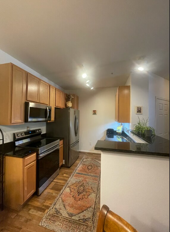 FULLY FURNISHED, READY TO MOVE IN. 6 to 12 month lease available. This fully furnished 2 bedroom, 2 bathroom unit has been thoughtfully updated and is move in ready with fresh paint and high quality LVP wood flooring. The large living room features a gas fireplace and opens to a private deck, offering space for outdoor eating. The updated kitchen is equipped with new stainless Samsung appliances, 42" cabinets, abundant counter space.. Plenty of room for entertaining with the spacious dining area that is ideal for gatherings. Plenty of kitchen supplies for cooking at home. Dining table for 4. The primary suite is a retreat with a generously sized room, a slider to a second private deck, a huge walk-in closet, and a spacious full bath with double sinks and extra storage. King size Sleep number adjustable bed is a dream. The second bedroom is filled with natural light through large windows, and the second full bath includes a tub and shower. One twin bed with desk and TV. All Linens included. Full-size laundry in the unit, along with shelving, facilitates easy one-level living. Residents can enjoy the community pool, hot tub and fitness centerOwner covers trash, recycling, water, wifi. Renter pays gas and electric. Enjoy the ease of fully-furnished living in this immaculate space that sleeps 1-3 and boasts high ceilings, spacious rooms, and ample storage. The convenient front entry, close to parking, ensures easy access without the need for stairs.