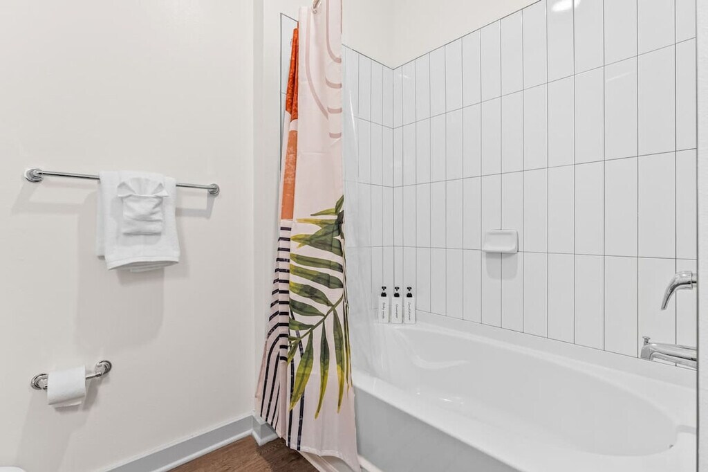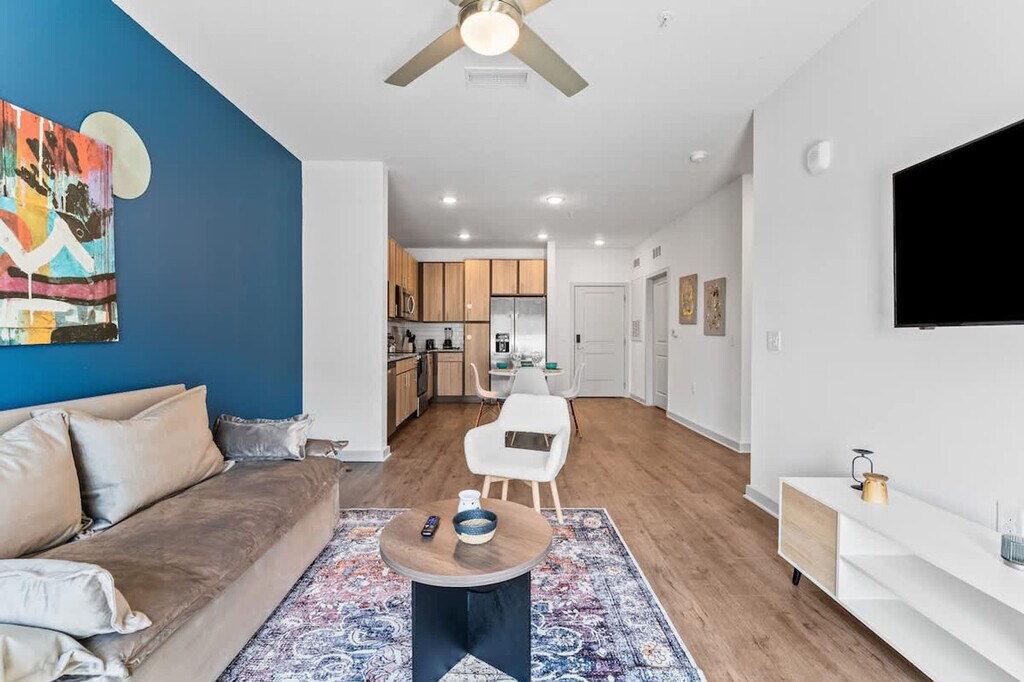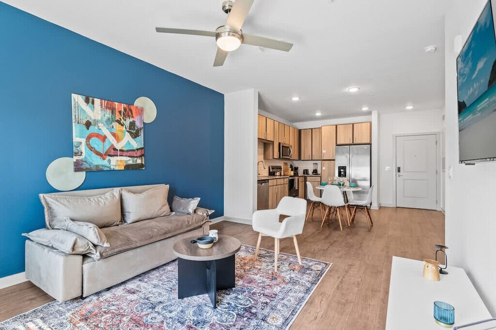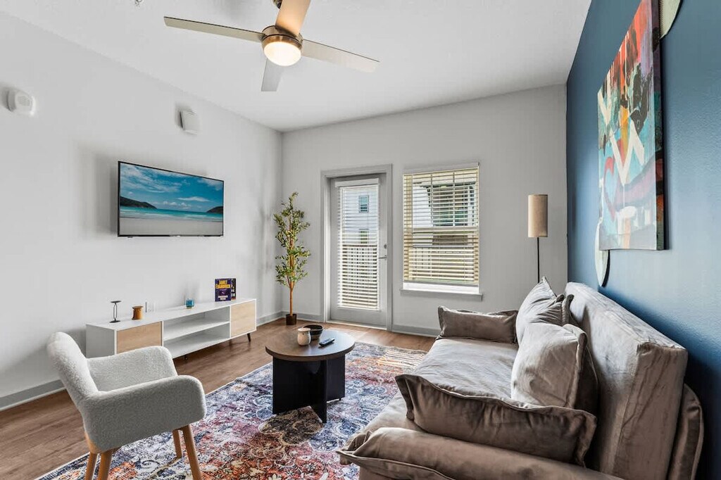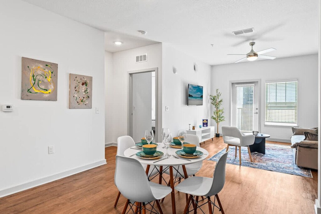 Feel at home in this perfectly located apartment, just 10 minutes from Orlando's magical parks. This cozy space sleeps four people and offers all the comforts of home. The apartment features a living room with a queen-size sofa bed and a 50” smart TV. The fully equipped kitchen includes a stove, microwave, refrigerator, coffee maker, dishwasher, cookware, utensils, and a dining table with four chairs. There is also an in-unit washer and dryer for your convenience. The bathroom offers a relaxing bathtub and shower, along with complimentary toiletries such as shampoo, conditioner, shower gel, hand soap, towels, and a hairdryer. Complimentary parking is available for up to three cars. An EV charger is available for electric vehicles, subject to availability, and a fee applies when used. A Pack 'n Play crib is provided with a crib sheet and blanket. Enjoy a peaceful retreat that's still close to the action. Disney Parks are just 10 minutes away, including Magic Kingdom, EPCOT, Animal Kingdom, and Hollywood Studios. Universal Studios is about 20 minutes away, home to The Wizarding World of Harry Potter. You'll also find vibrant shops, restaurants, and bars close to the property, many within walking distance. Pets are welcome, but some breed restrictions apply. Quiet hours are between 10 PM and 8 AM.