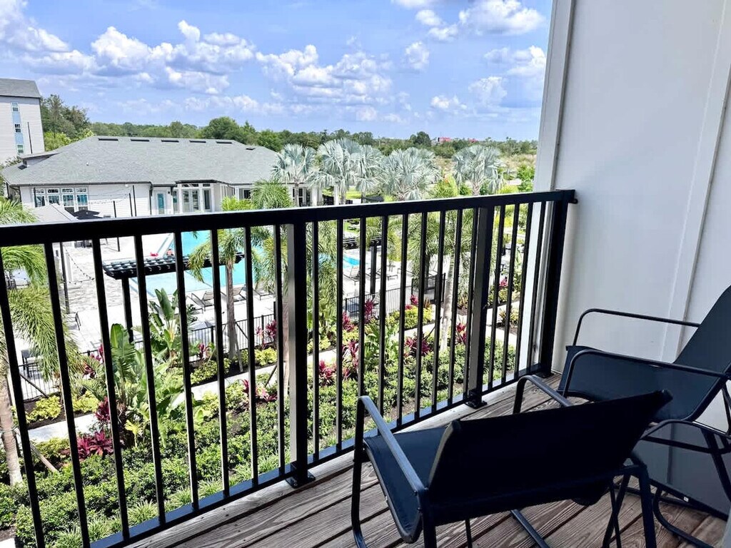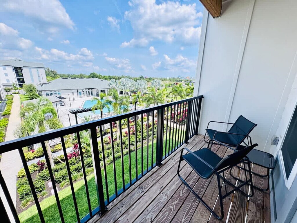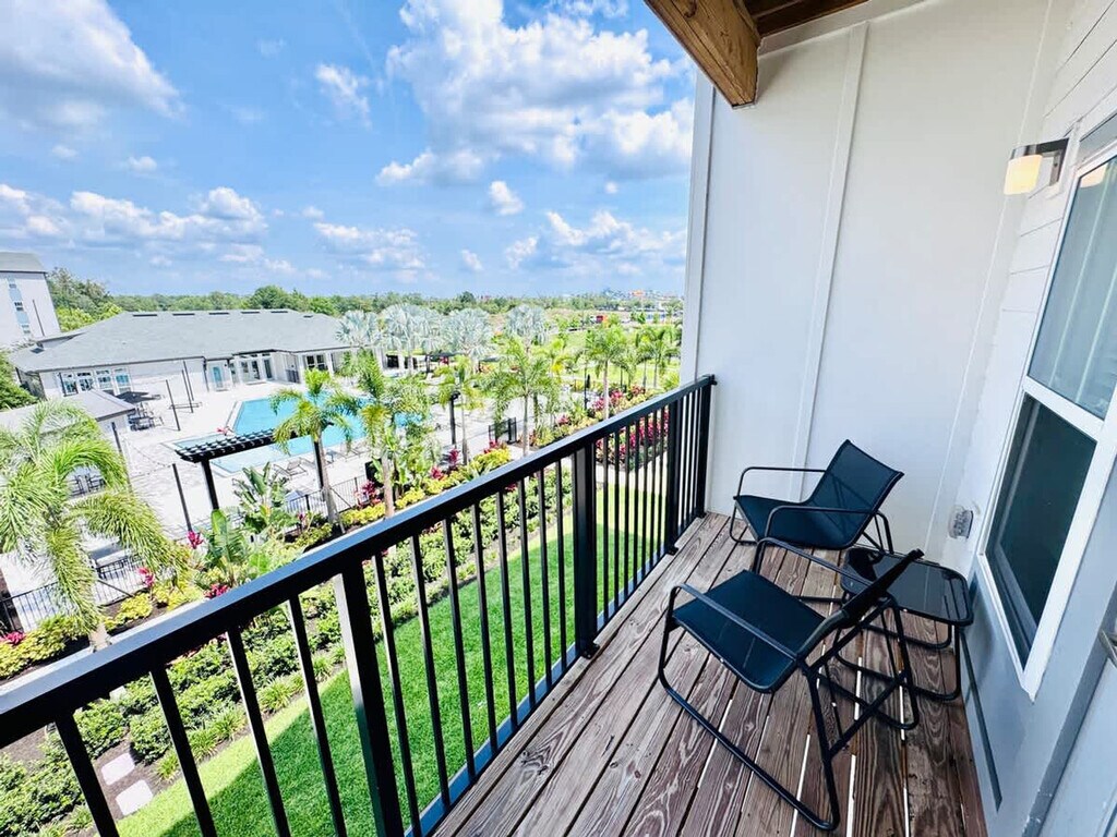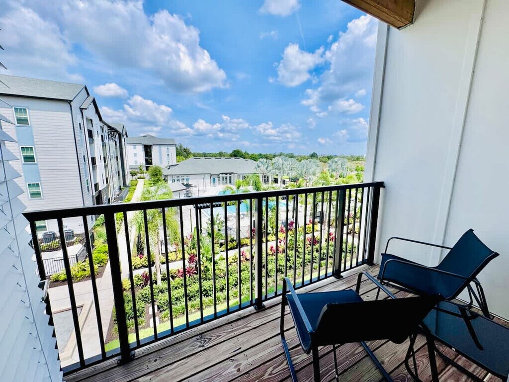 Feel at home in this perfectly located apartment, just 10 minutes from Disney Parks and a short drive to Universal Studios. This cozy space comfortably sleeps four guests. The apartment features a living room with a queen-size sofa bed and a 50" smart TV, and a bedroom with a plush king-size bed and a 43" smart TV. The fully equipped kitchen includes a stove, microwave, refrigerator, coffee maker, dishwasher, cookware, and utensils. Enjoy the convenience of an in-unit washer and dryer. Complimentary parking is available for up to three cars. An EV charger is available for electric vehicles, subject to availability, with a fee applied when used. Located near Disney and Universal, this apartment offers a peaceful retreat close to vibrant shops, restaurants, bars, and recreational spots, many within walking distance. Pets are welcome, but some breed restrictions apply. Quiet hours are between 10 PM and 8 AM. Standard check-in time is 4 PM, and early check-ins can be arranged upon request. Relax and enjoy the fresh air on your private balcony with a seated area. Complimentary toiletries are provided, including shampoo, conditioner, shower gel, hand soap, towels, and a hairdryer. A Pack 'n Play crib is also provided with a crib sheet and blanket. Luggage drop-off is available after 12:30 PM with advance notice.