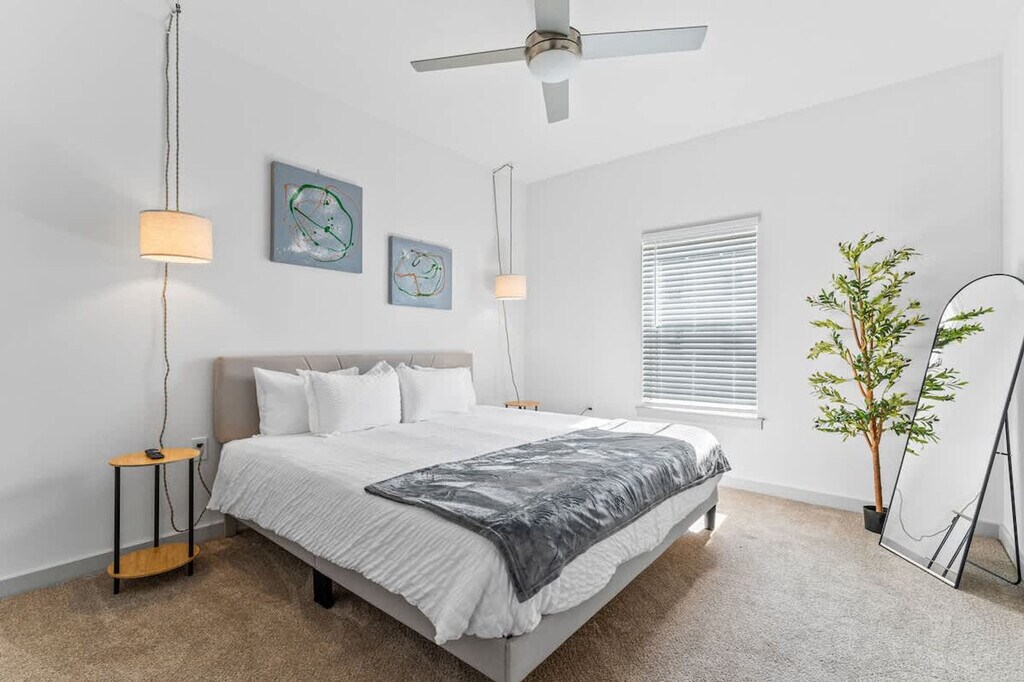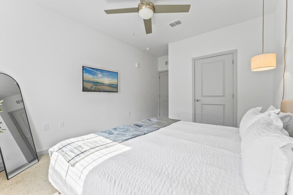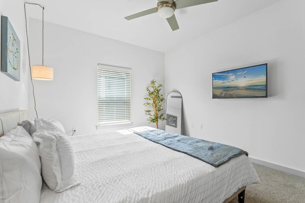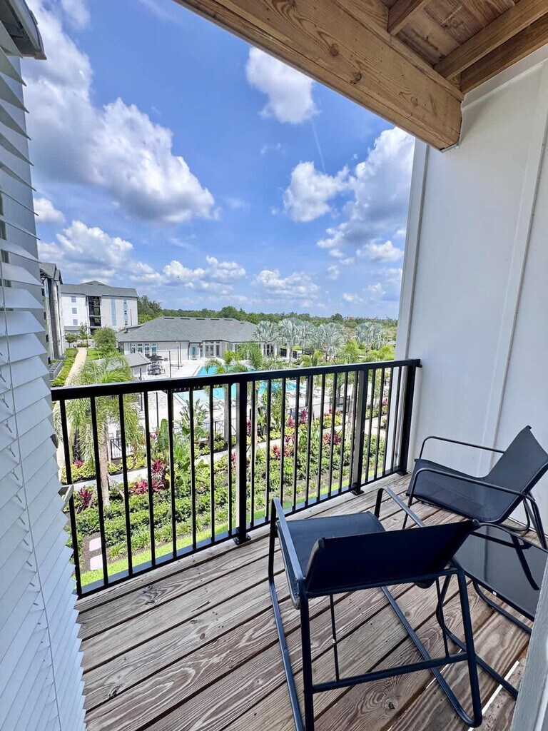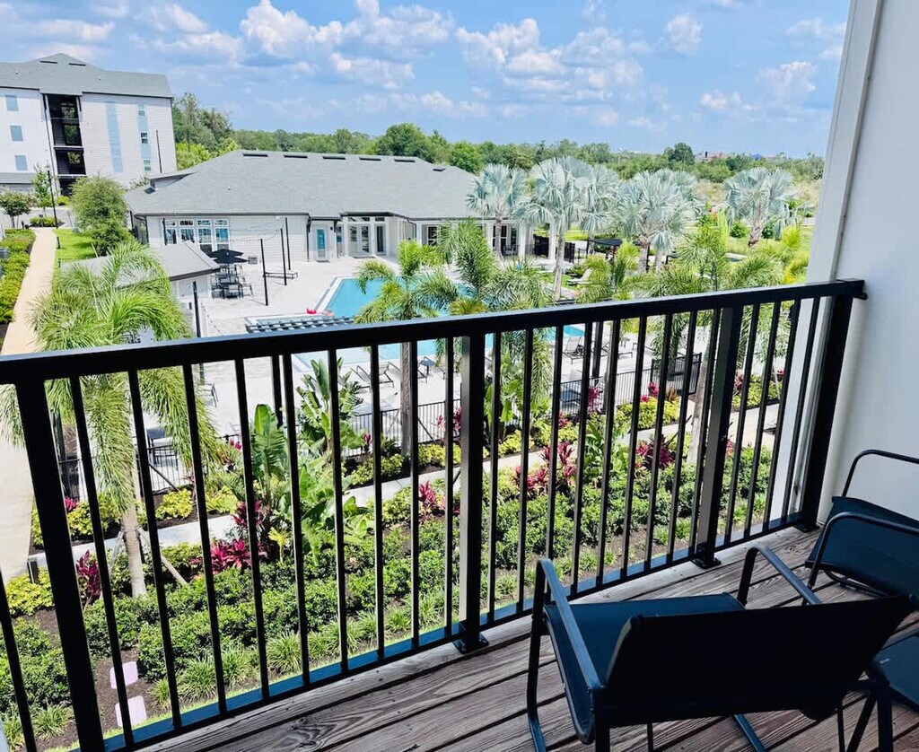 Feel at home in this perfectly located apartment, just 10 minutes from Disney Parks and a short drive to Universal Studios. This cozy space comfortably sleeps four guests. The apartment features a living room with a queen-size sofa bed and a 50" smart TV, and a bedroom with a plush king-size bed and a 43" smart TV. The fully equipped kitchen includes a stove, microwave, refrigerator, coffee maker, dishwasher, cookware, and utensils. Enjoy the convenience of an in-unit washer and dryer. Complimentary parking is available for up to three cars. An EV charger is available for electric vehicles, subject to availability, with a fee applied when used. Located near Disney and Universal, this apartment offers a peaceful retreat close to vibrant shops, restaurants, bars, and recreational spots, many within walking distance. Pets are welcome, but some breed restrictions apply. Quiet hours are between 10 PM and 8 AM. Standard check-in time is 4 PM, and early check-ins can be arranged upon request. Relax and enjoy the fresh air on your private balcony with a seated area. Complimentary toiletries are provided, including shampoo, conditioner, shower gel, hand soap, towels, and a hairdryer. A Pack 'n Play crib is also provided with a crib sheet and blanket. Luggage drop-off is available after 12:30 PM with advance notice.