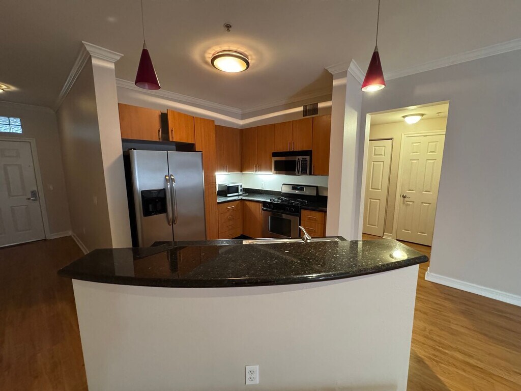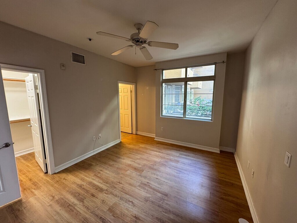 Experience upscale urban living in this beautifully maintained 3 bed / 2 bath condo in the heart of East Village, San Diego. Enjoy breathtaking views of Downtown and the Coronado Bridge from your private balcony, all within walking distance to Gaslamp, Little Italy, and countless dining and entertainment options. Highlights Spacious ~1,350 sq. ft. open floor plan on the 5th floor of a modern mid-rise building TWO side-by-side parking spaces — no car shuffling required TWO private storage cages in the secure underground garage Private balcony perfect for relaxing or entertaining Panoramic city and water views Luxury Interior Features Modern kitchen with granite countertops, custom cabinets, and large island — ideal for entertaining Brand new 28 cu. ft. stainless steel refrigerator with water & ice dispenser Gas stove (gas included in rent) and built-in microwave Reverse osmosis water filter for clean, great-tasting water In-unit washer & dryer Custom built-in bar in the living room Dedicated work-from-home area with built-in desk and shelving in the hallway Abundant storage space throughout Bedrooms & Baths All bedrooms feature large windows, walk-in closets, and ceiling fans with remote controls Primary suite located opposite secondary bedrooms for added privacy Primary bath with double-sink vanity Third bedroom includes custom built-in desk and shelving — perfect as a home office or guest room Comfort & Security Central heating and A/C Ring doorbell for added security and package monitoring Community Amenities Access to gym, jacuzzi, and residents’ lounge Electric vehicle charging stations on-site BBQ areas throughout the property (electric grills allowed on private patios)