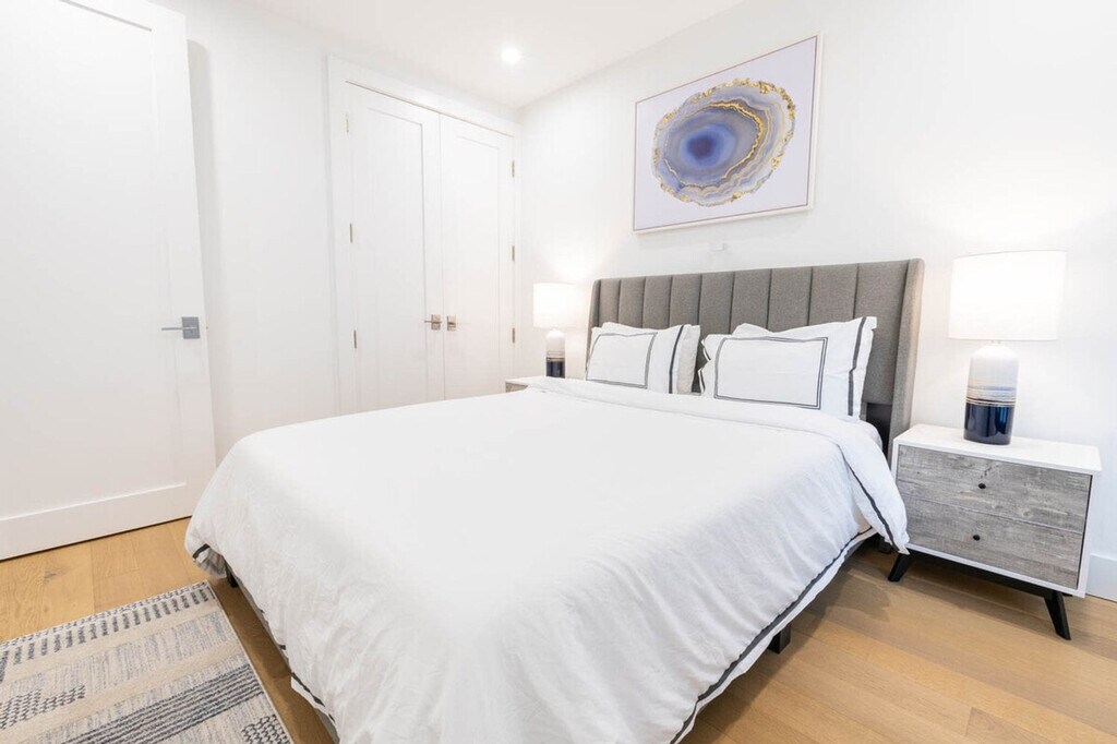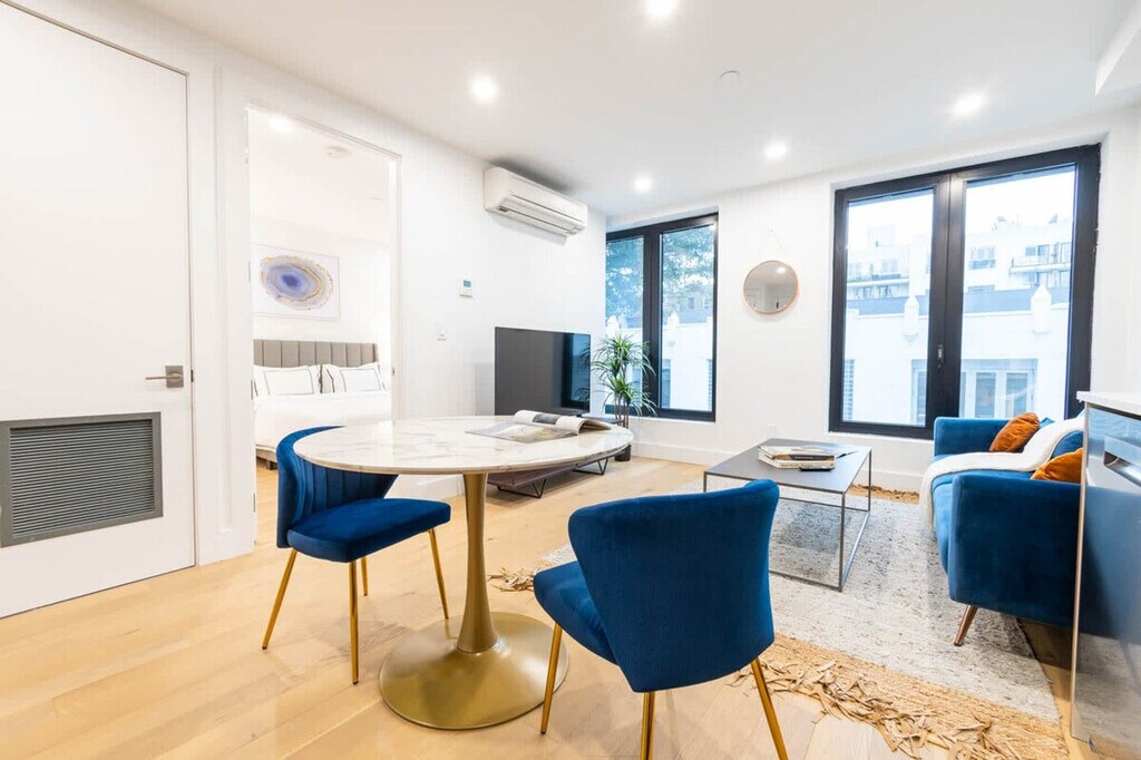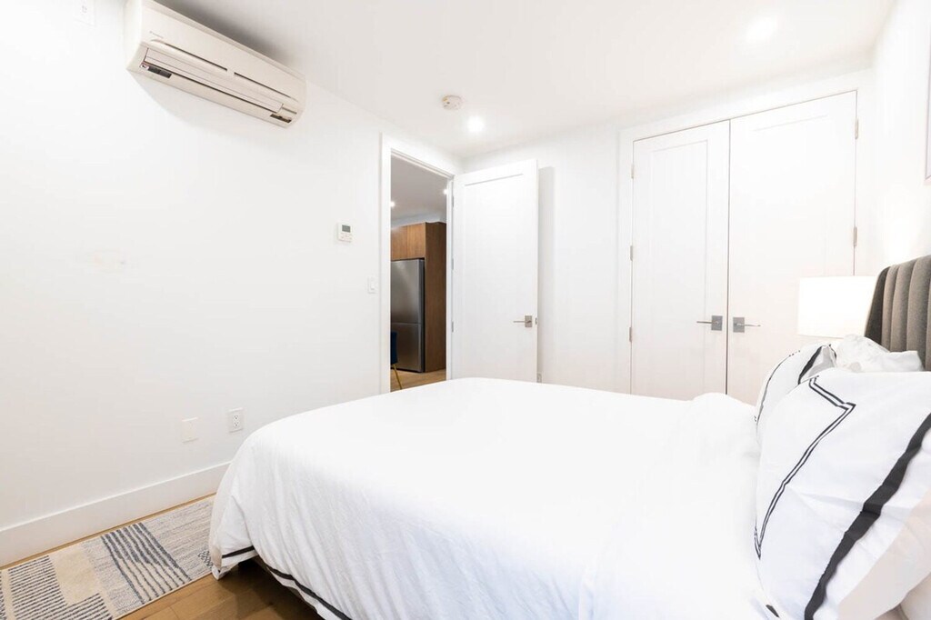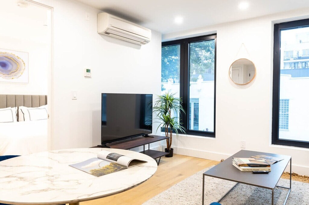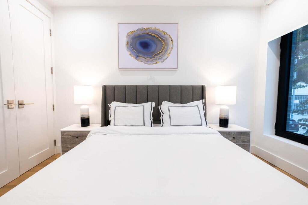 Immerse yourself in the ultimate luxury experience with this sophisticated Greenpoint condominium available for rent. Boasting a rare 1-bedroom, this brand new and exclusive elevator building offers the perfect blend of comfort and style. With floor-to-ceiling windows, designer kitchen and bath, and a spacious living room, this stunning residence is the epitome of elegance. Enjoy the convenience of having a washer and dryer in the unit and an elevator for ease of access. This brand new and modern 1-bedroom, 1-bath apartment located in prime Greenpoint is the perfect place for anyone visiting New York for work or pleasure. Completely new and designed with great emphasis on comfort, luxury, and detail, this homey apartment is bright and full of light, with a warm and sophisticated ambiance. The kitchen is fully equipped with brand new appliances, and the apartment is furnished with modern and chic decor throughout. Featuring a spacious and fun living area with a flat screen TV and sofa-bed, a dining table, and great closet space throughout the apartment, this space is perfect for unwinding after a long day exploring the city. The bedroom features a luxurious queen-size bed, and high-speed Wi-Fi is available throughout the apartment. Fresh linens, towels, and extra pillows are also provided. With subway stations conveniently located all around, you'll have easy access to explore all the city has to offer, including a wide variety of restaurants and cuisines. This is the perfect location for those seeking to experience the real New Yorker's lifestyle, with museums, great cafes, delis, restaurants, gyms, bars, pubs, live music, and the lovely Hudson highway boardwalk all within reach. Greenpoint is a neighborhood located in the northernmost part of Brooklyn, New York City. It is bounded by the East River to the west, Newtown Creek to the north and east, and Williamsburg to the south. Known for its Polish-American heritage, Greenpoint has a thriving arts and creative scene, with a wide variety of independent shops, restaurants, and cafes. The neighborhood is also known for its waterfront parks and recreational spaces, as well as its easy access to transportation via several subway and bus lines. This new modern boutique building features video intercoms and a security system for your peace of mind. With all the amenities and a prime location, it will be almost impossible to say goodbye to this apartment and location. All you need to move in is a toothbrush! [SI]