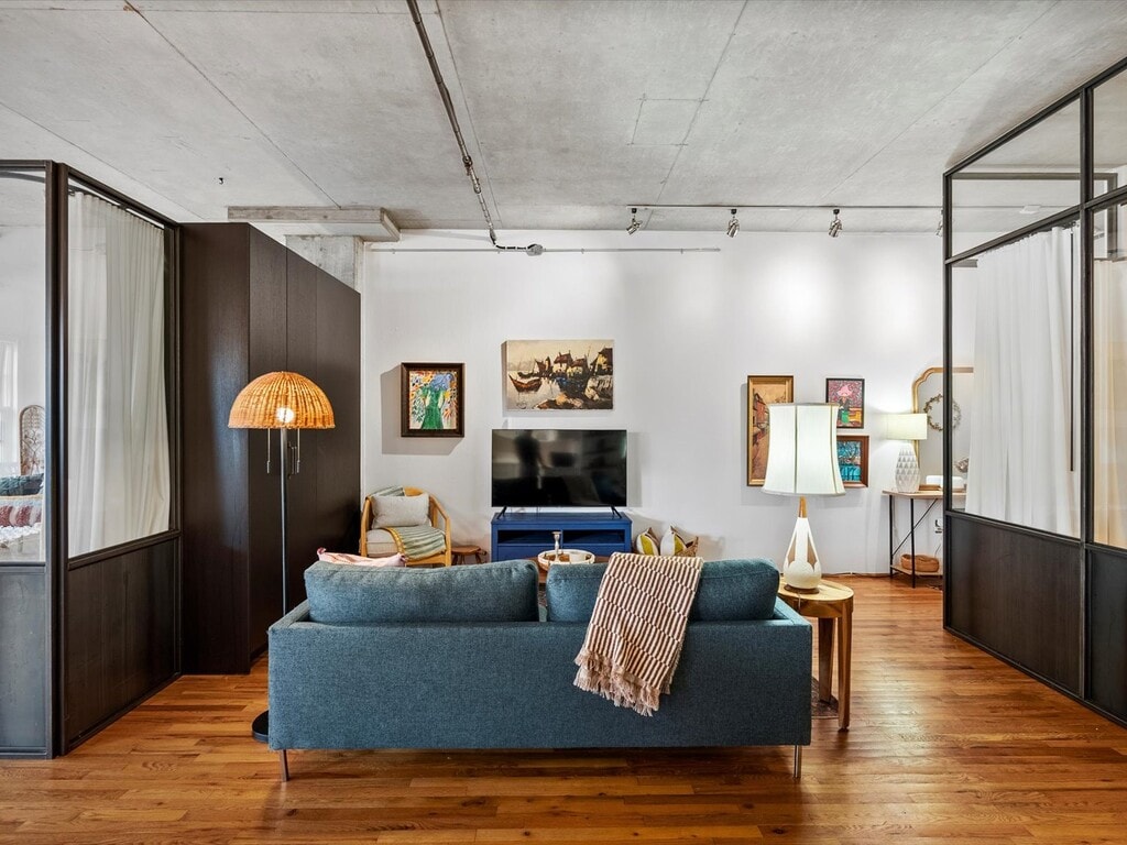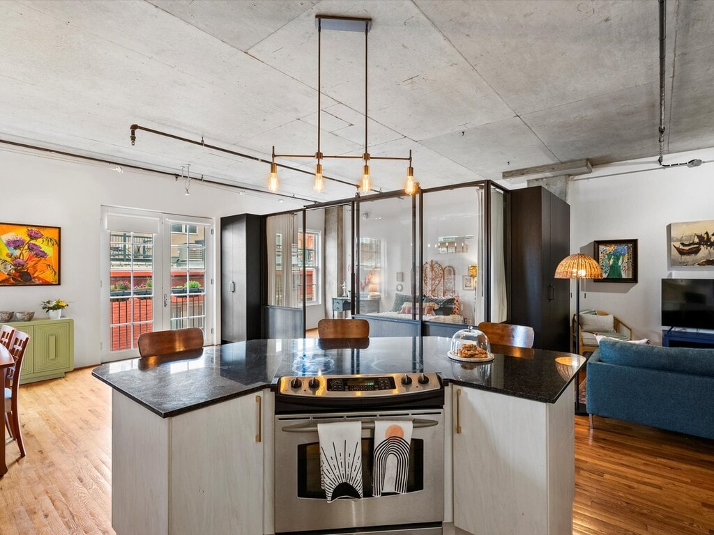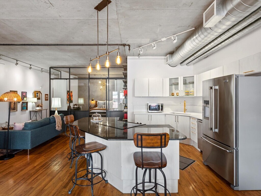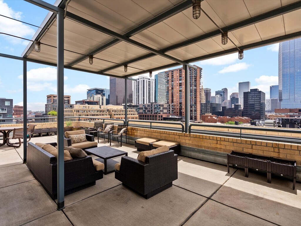 Available for residency starting May 1, this stunning, fully-furnished 1-bedroom, 1.5-bath loft perfectly combines architectural character with upscale convenience. The entry features a dedicated seating space, abundant storage for shoes and personal items, and built-in racks for 3–4 bikes. A convenient half-bath near the entry ensures guest privacy. Step into a light-filled living area with soaring ceilings, exposed ductwork, and hardwood floors throughout. The open living room includes a camel-colored leather sofa and chair, seamlessly connecting to a chef-inspired kitchen with sleek cabinetry, a flat-top range with vented hood, a large granite island with built-in bar seating for three, and ample storage. Adjacent is a rare 6-person dining area offering expansive city views, ideal for entertaining. The luxurious master suite, separated by French doors, features a king-size bed, generous closet space, and a private en-suite bath. The experience extends outdoors to a large, covered balcony with panoramic skyline views, complete with comfortable seating and a table for morning coffee or brunch. Additional conveniences include an in-unit washer and dryer, custom storage near the laundry, and a deeded underground parking space with private storage. Internet, water, electricity are also included. Residents enjoy 24-hour lobby service, a fully equipped gym, a professional conference room, and a 10th-floor community terrace. Perfectly located steps from Denver’s finest dining, entertainment, sporting events, parks, culture, and transit. Condominium MLS# 5877360